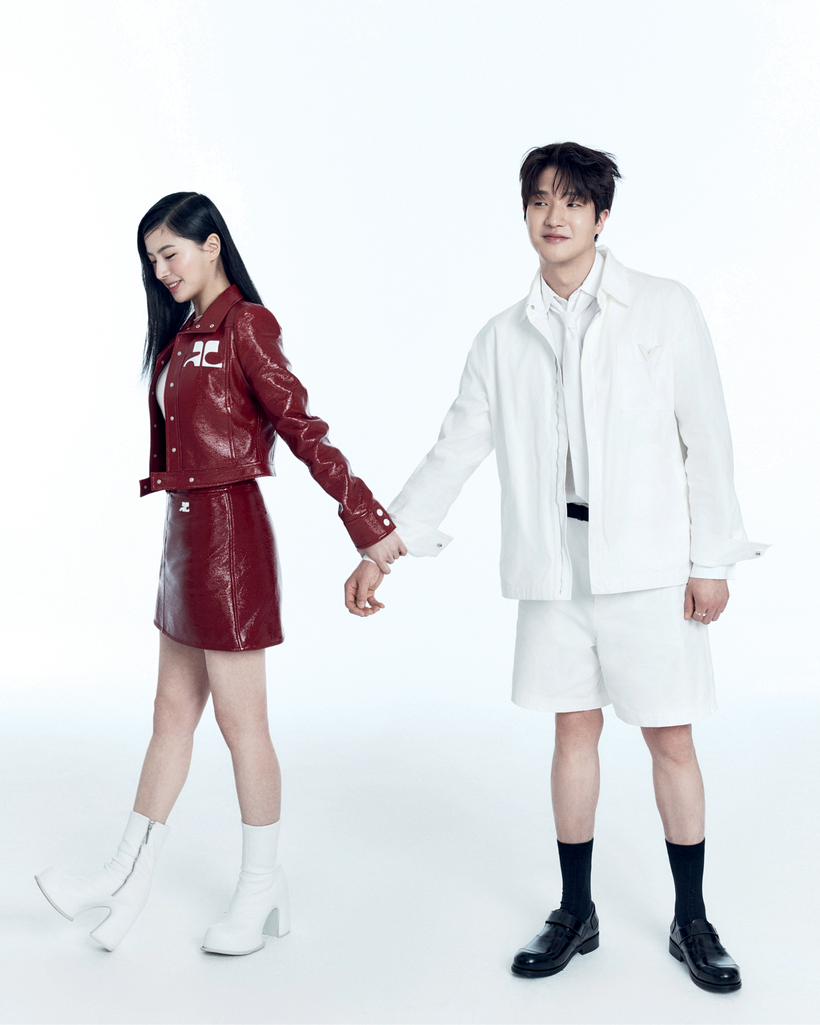 지원이 입은 재킷과 스커트는 모두 Courrèges. 핑크 슬리브리스 이너 웨어 톱은 Noirnine. 슈즈는 Charles & Kieth. 네크리스는 스타일리스트 소장품. 윤재가 입은 재킷과 셔츠, 팬츠, 타이는 모두 Valentino. 슈즈는 Stefan Cooke. 벨트는 스타일리스트 소장품.