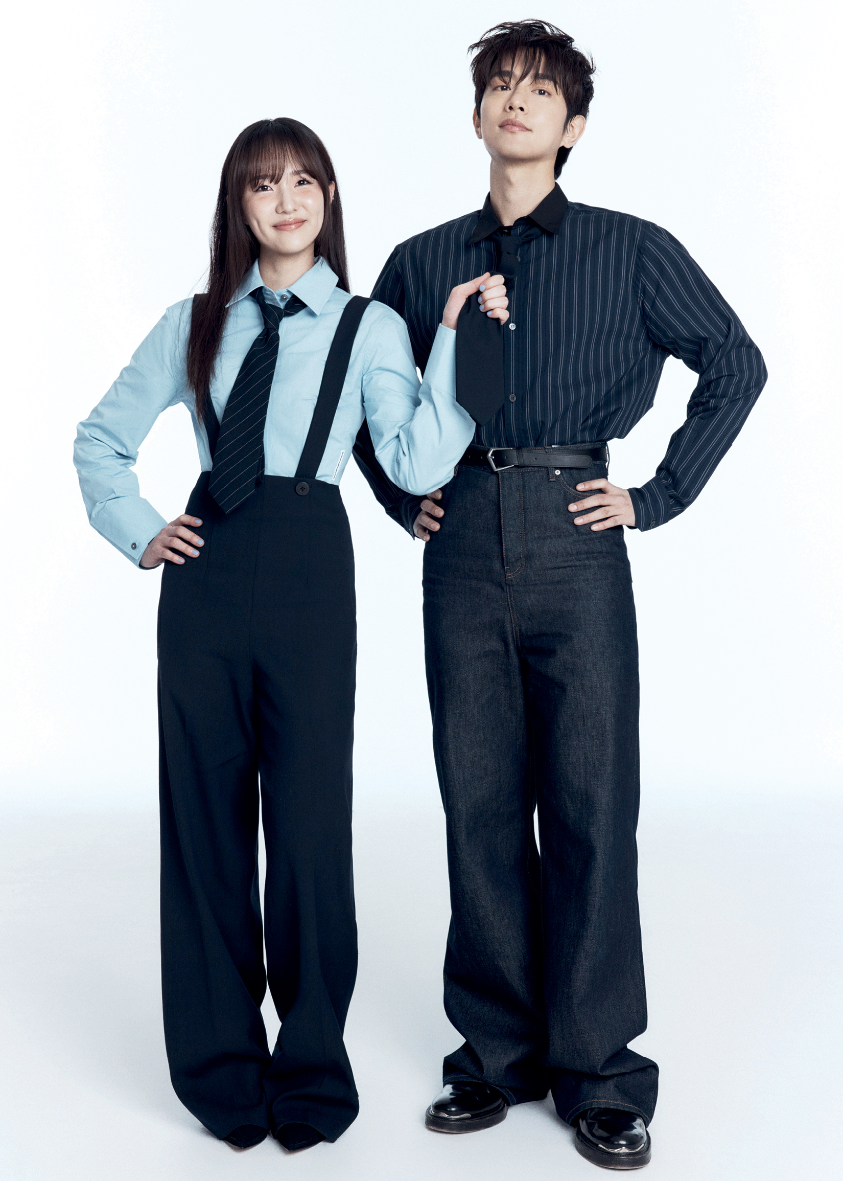 세승이 입은 셔츠는 Alexanderwang. 팬츠는 Claudie Pierlot. 슈즈는 Kristin. 타이는 스타일리스트 소장품. 재형이 입은 셔츠와 팬츠는 모두 Loewe. 슈즈는 Ordinary People. 타이와 벨트는 모두 스타일리스트 소장품.