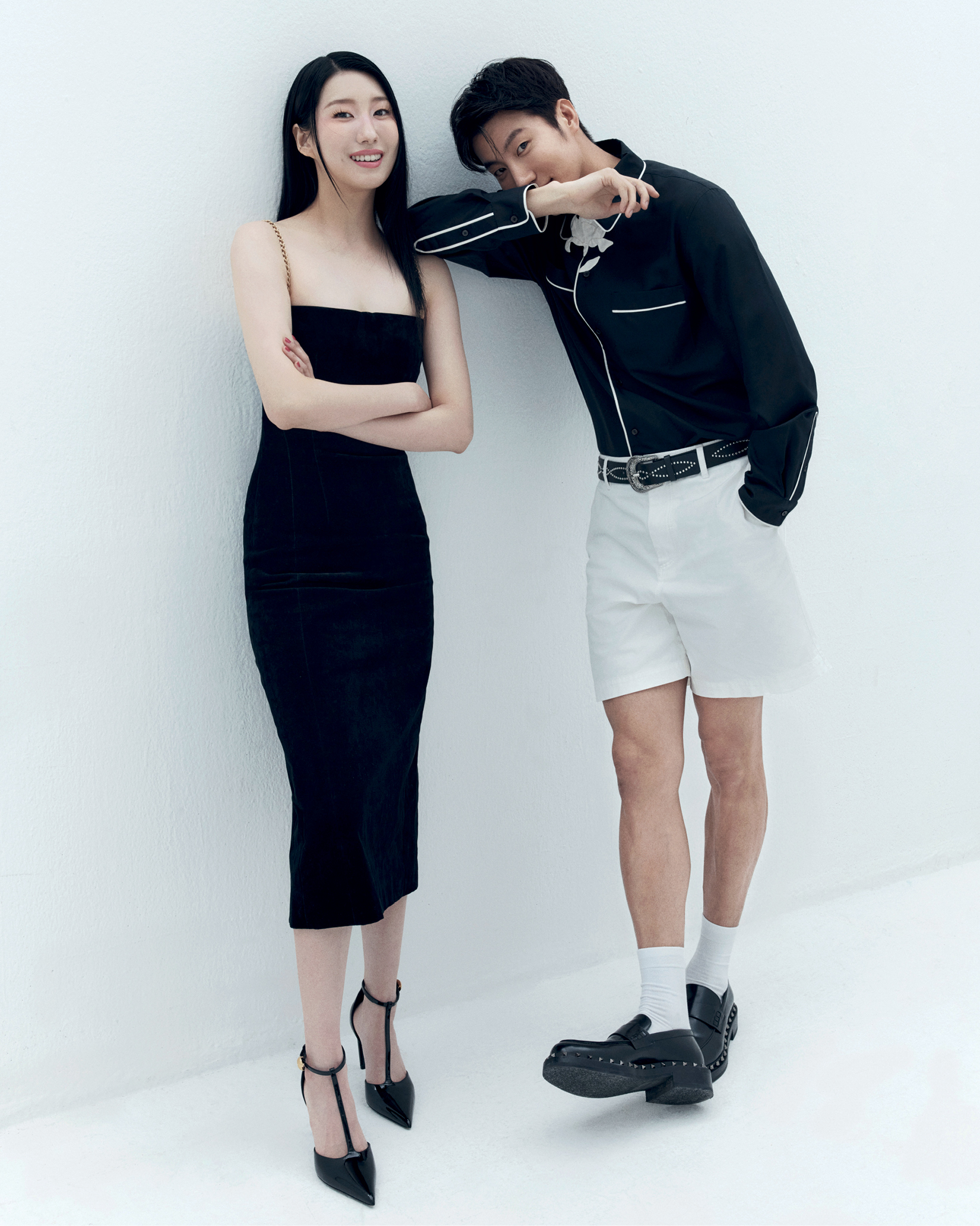 주연이 입은 블랙 드레스와 슈즈는 모두 Ferragamo. 용우가 입은 셔츠와 팬츠는 Valentino. 슈즈는 Valentino Garavani. 삭스와 벨트는 모두 스타일리스트 소장품.