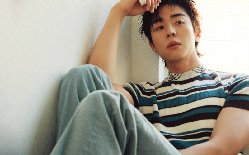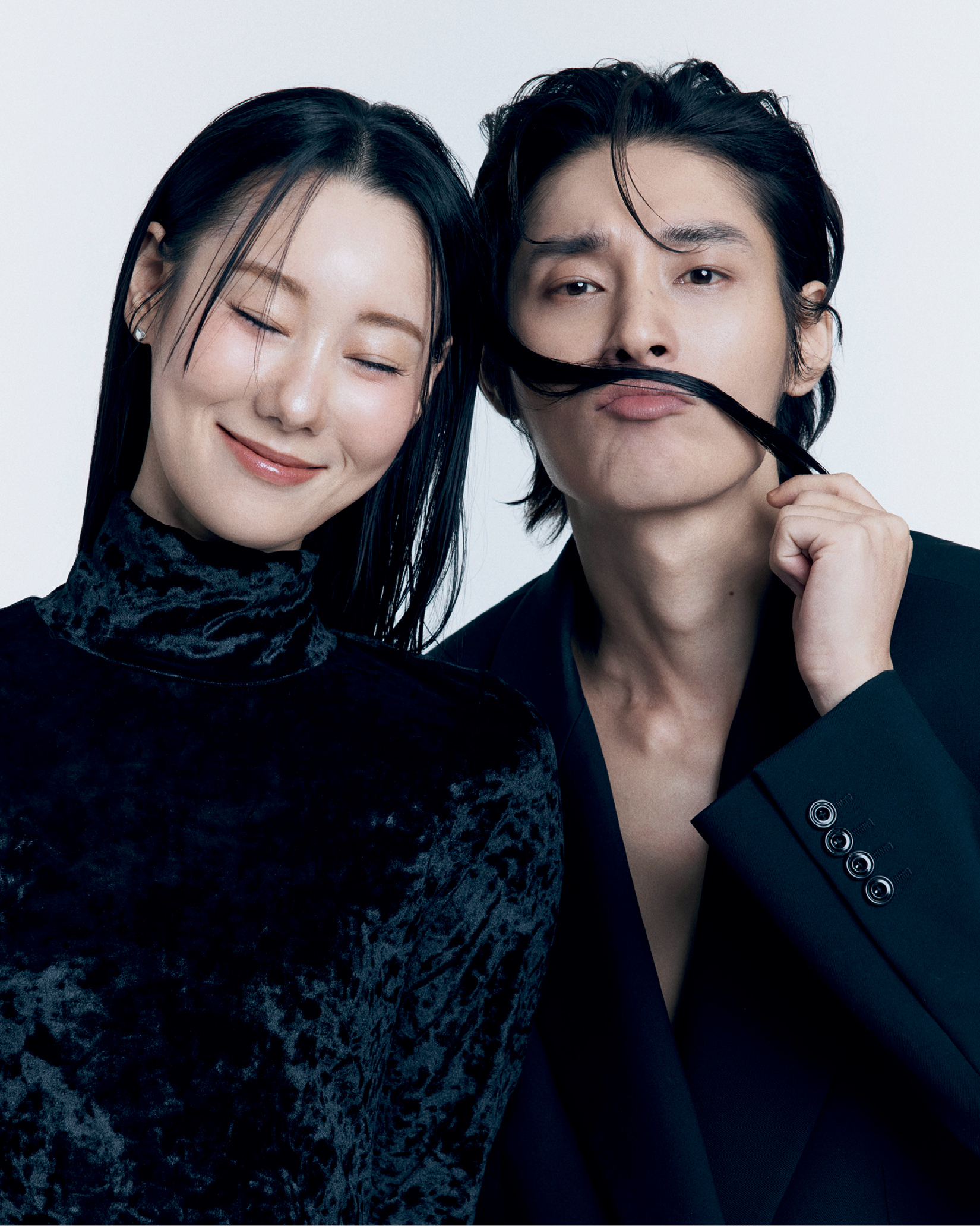 정섭이 입은 재킷과 팬츠는 모두 Neu_In. 반지는 Roaju. 윤하가 입은 재킷과 팬츠는 모두 Marni. 브라운 이너 웨어 톱은 Courrèges. 벨트는 스타일리스트 소장품.