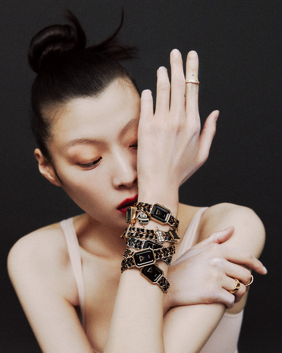 서로 연결한 18K 옐로골드 코팅 ‘프리미에르 오리지널 에디션’ 워치와 참 장식의 ‘프리미에르 참 꾸뛰르’ 워치, 스틸 케이스의 ‘프리미에르 아이코닉 체인’ 워치, 두 개의 ‘프리미에르 오리지널 에디션’ 워치, 왼손 검지에 낀 다이아몬드를 세팅한 ‘코코 크러쉬’ 미니 링, 오른손 중지에 낀 ‘코코 크러쉬’ 미니 링과 약지에 낀 ‘코코 크러쉬’ 스몰 링은 모두 Chanel Watches & Fine Jewelry.
