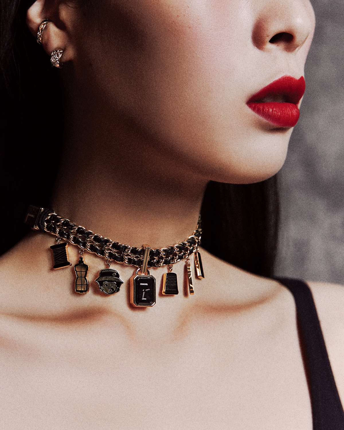 체인 브레이슬릿과 참 장식이 어우러진 ‘프리미에르 참 꾸뛰르’ 워치, 18K 옐로골드 ‘코코 크러쉬 다이아몬드’ 싱글 이어링, 18K 베이지골드 ‘코코 크러쉬 다이아몬드’ 이어링은 모두 Chanel Watches & Fine Jewelry.