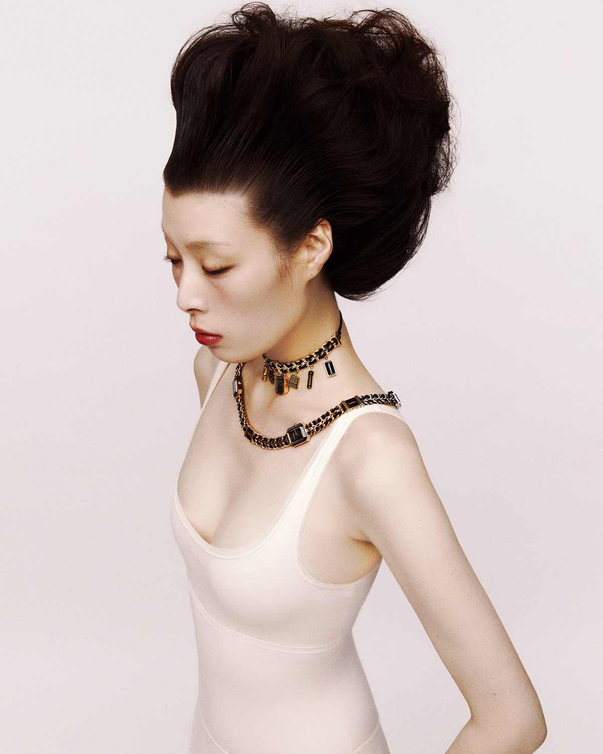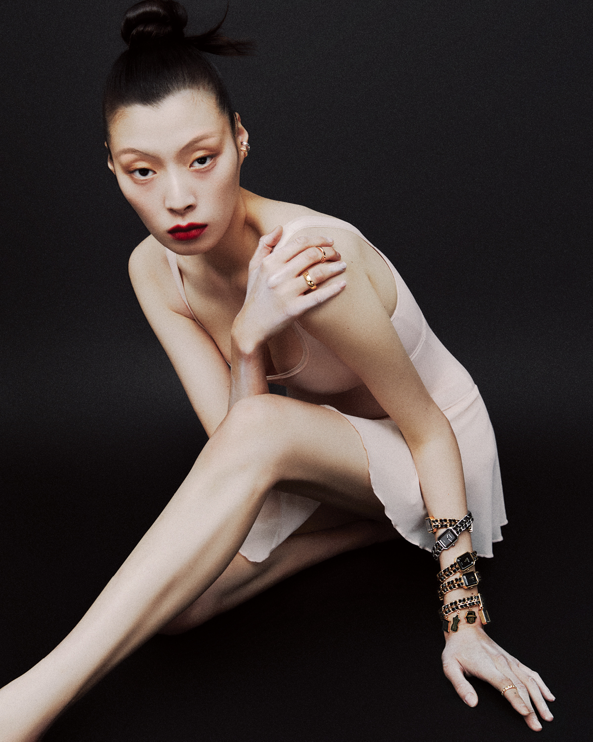 오른손 중지에 낀 ‘코코 크러쉬’ 미니 링과 약지에 낀 ‘코코 크러쉬’ 스몰 링, 왼 손목에 레이어드한 18K 옐로골드 코팅 ‘프리미에르 오리지널 에디션’ 워치, 스틸 케이스의 ‘프리미에르 아이코닉 체인’ 워치, 참 장식이 특징인 ‘프리미에르 참 꾸뛰르’ 워치, 18K 옐로골드 ‘코코 크러쉬’ 다이아몬드 미니 링, 화이트골드 ‘코코 크러쉬’ 싱글 이어링. 18K 옐로골드 ‘코코 크러쉬 다이아몬드’ 싱글 이어링은 모두 Chanel Watches & Fine Jewelry.