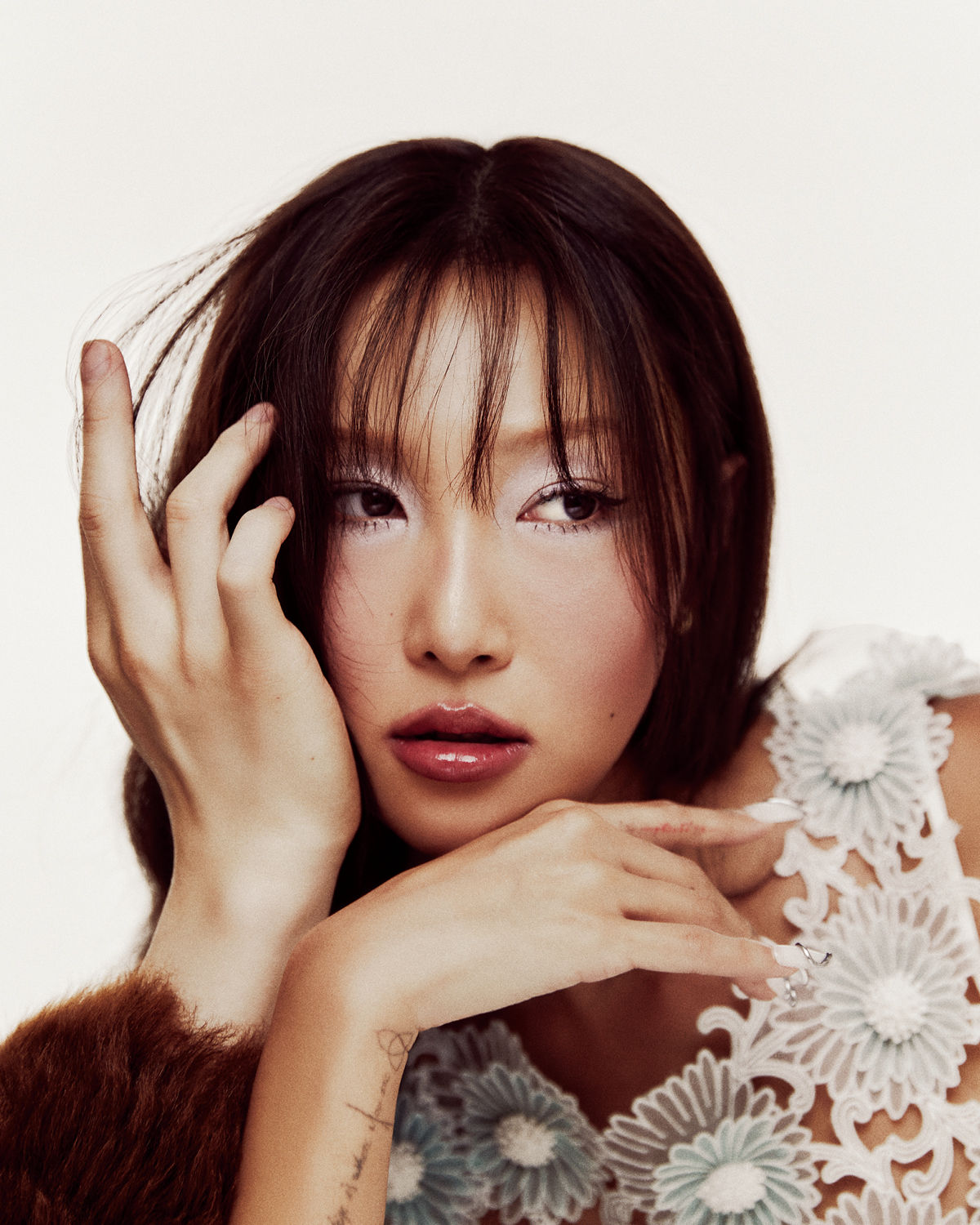 화사가 착용한 시스루 톱과 시스루 스커트, 레이어드한 마이크로 미니스커트, 페더 장식의 슈즈는 모두 Ferragamo.