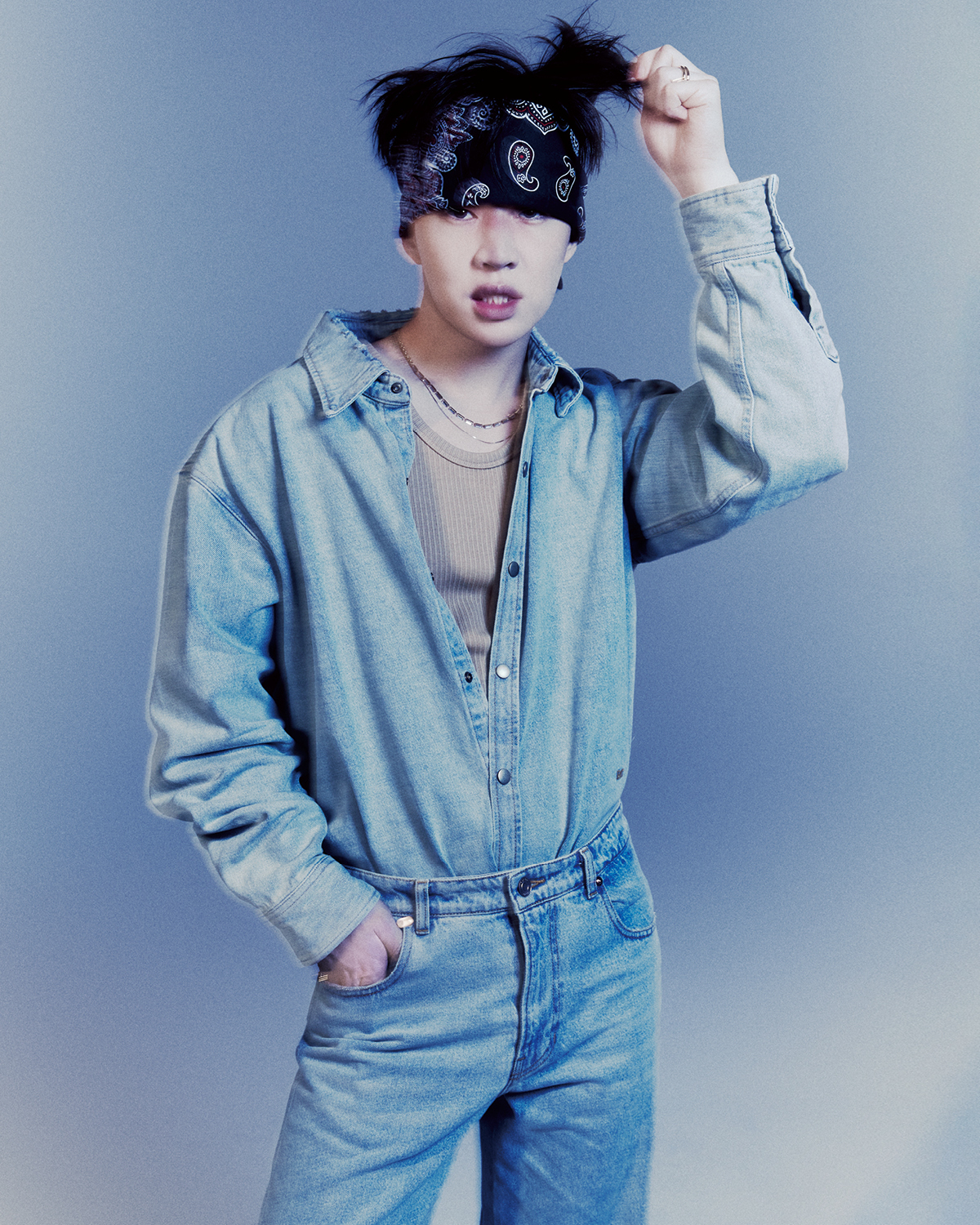 데님 셔츠와 팬츠, 이너 웨어로 입은 베이지 슬리브리스는 모두 Recto. 반다나와 네크리스는 모두 스타일리스트 소장품.