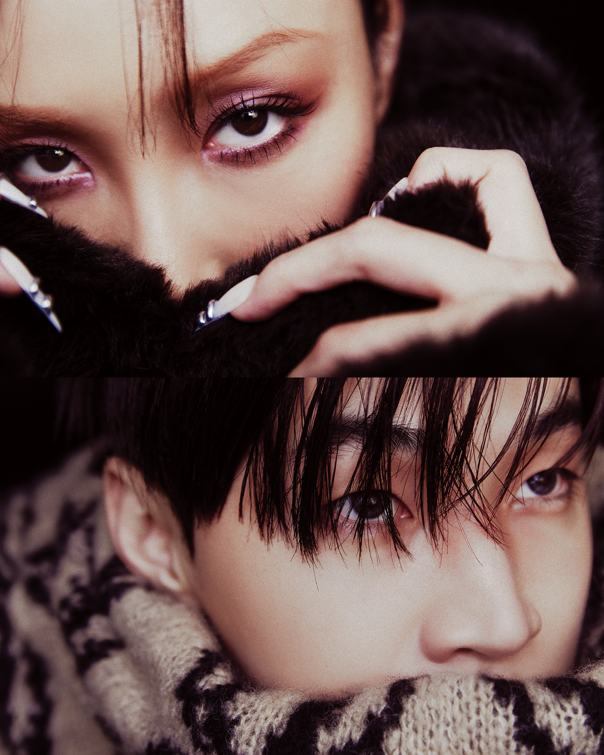 화사가 입은 퍼 소재의 후디드 톱은 We11done. 헨리가 입은 니트 풀오버는 Dries Van Noten.