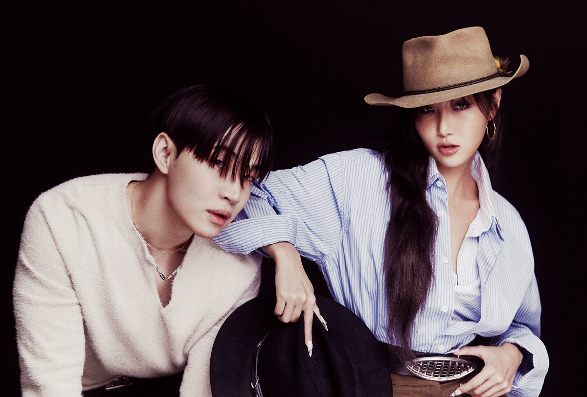헨리가 착용한 니트는 Young n Sang. 네크리스는 Onchic. 화사가 착용한 셔츠와 벨트, 팬츠는 모두 Tod’s. 이어링은 Portrait Report. 카우보이 햇은 스타일리스트 소장품.
