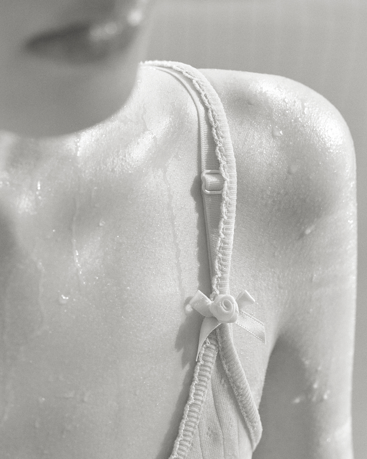 옅은 핑크 톤의 슬리브리스 톱은 Moilly. 레이스 브라톱은 Pelo a Pelo.