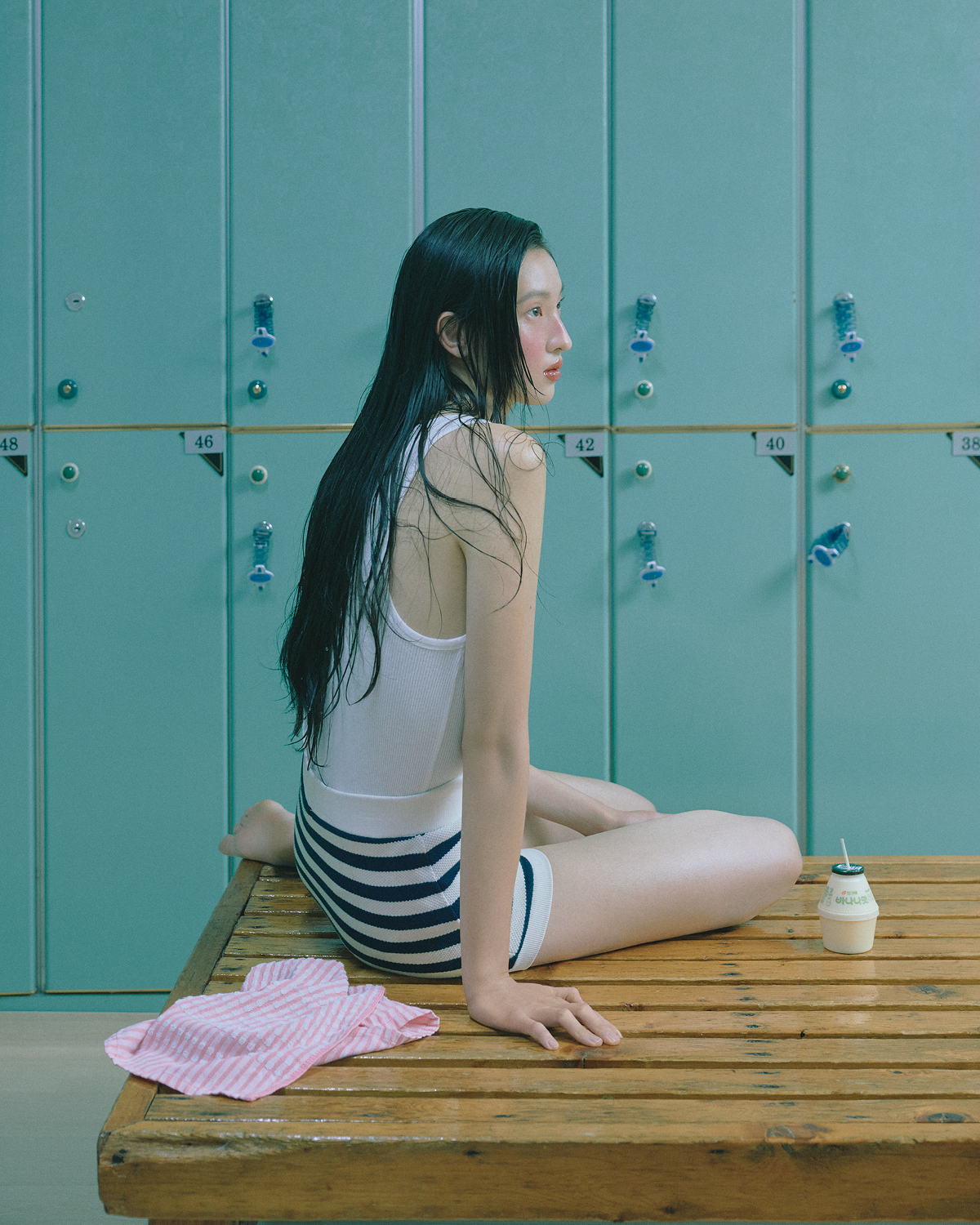 베이지 컬러의 니트 브라톱과 팬츠는 모두 Juukiff. 스트라이프 패턴의 비치 타월은 Tekla.