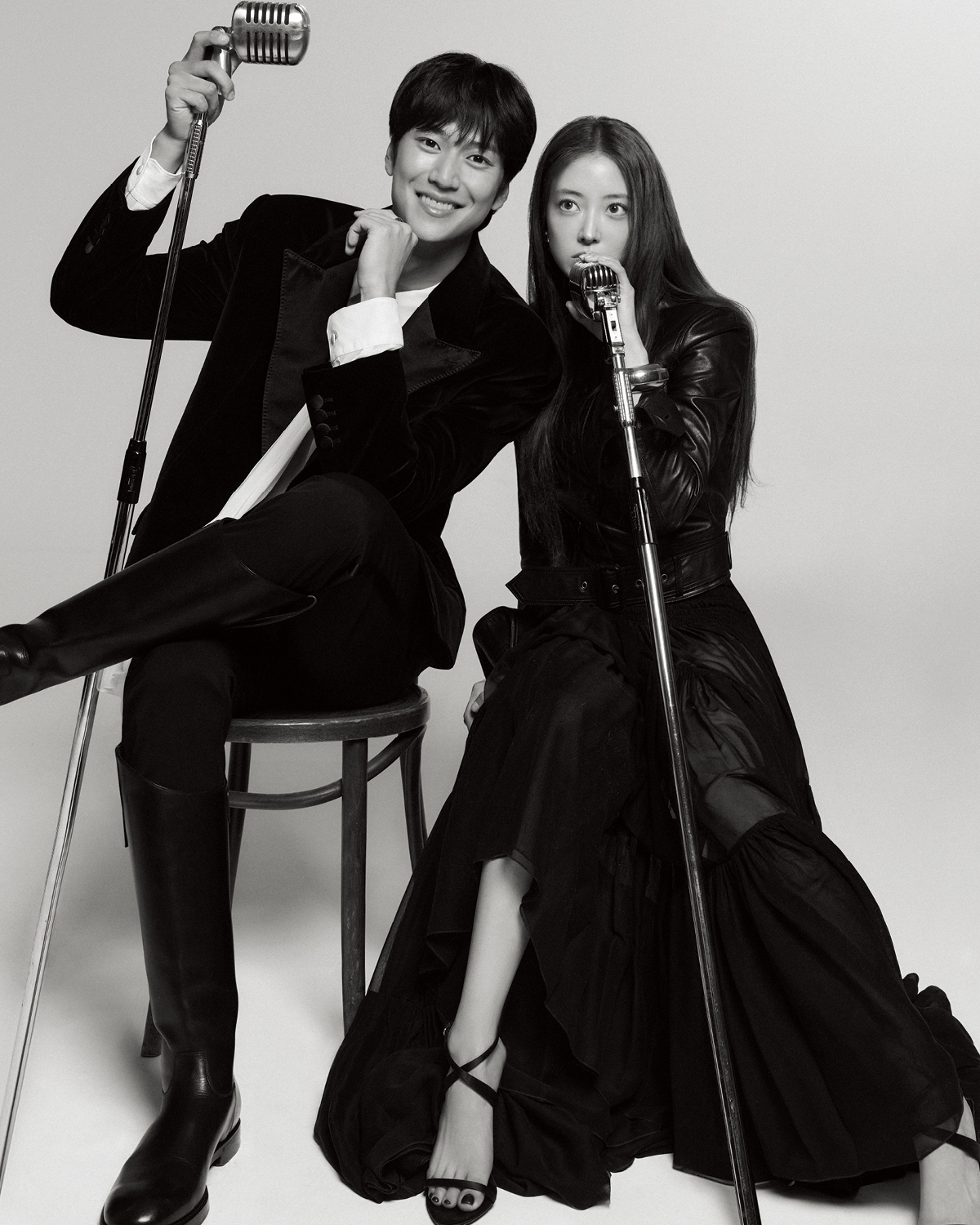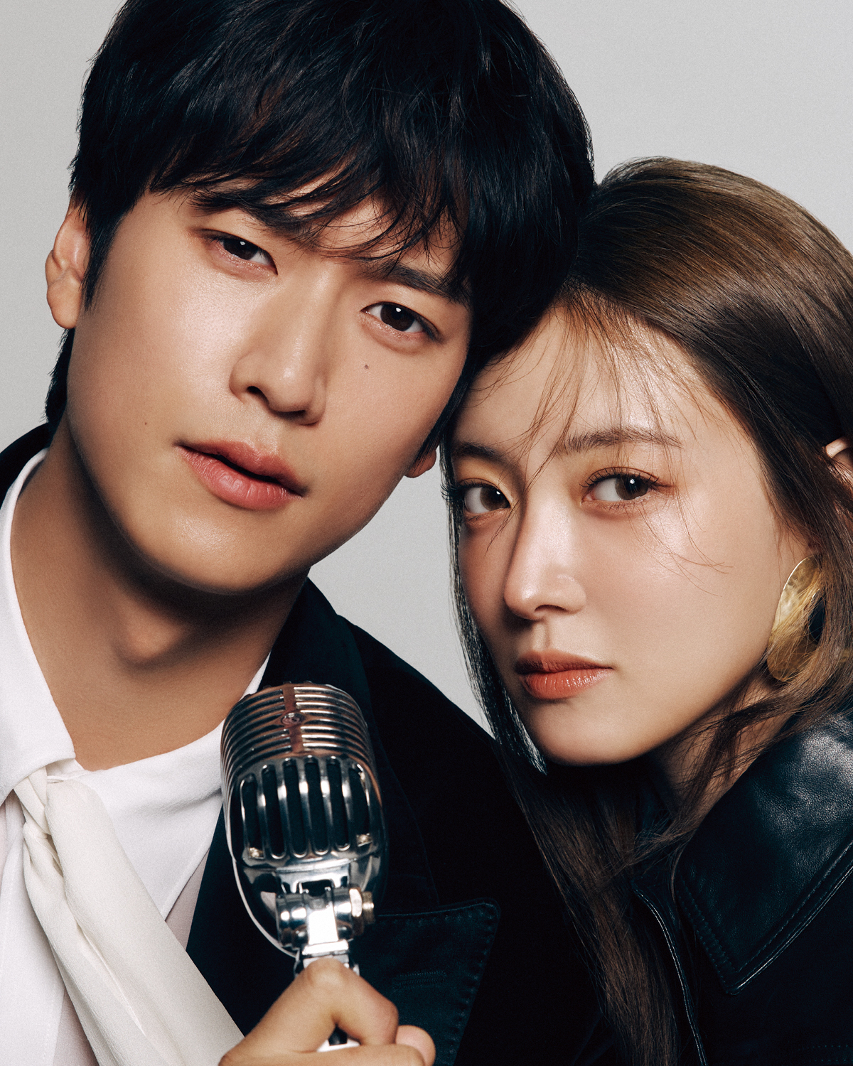 나인우가 입은 셔츠와 재킷은 모두 Dolce & Gabanna. 이세영이 입은 재킷과 볼드한 이어링은 모두 Saint Laurent by Anthony Vaccarello.