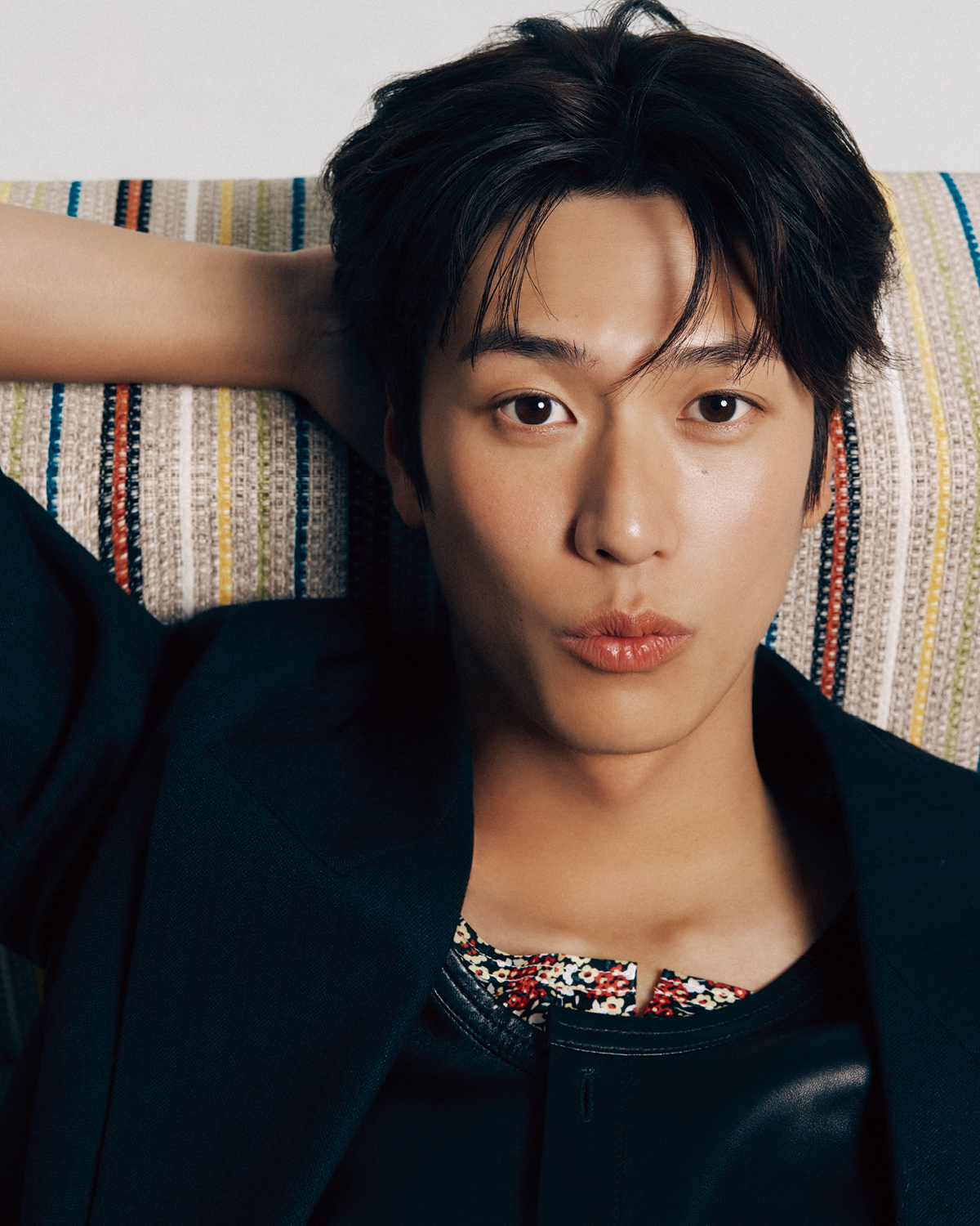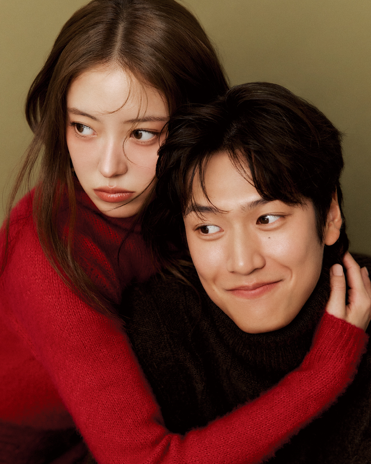 나인우가 입은 재킷과 이너 웨어 티셔츠, 팬츠는 모두 LeMaire. 네크리스는 Dolce & Gabanna. 이세영이 입은 체크 해링턴 재킷과 미디스커트는 모두 Recto. 이너 웨어로 입은 페이턴트 보디수트는 Tory Burch. 블랙 버클 부츠는 Roger Vivier. 골드 이어 커프는 Tom Wood.