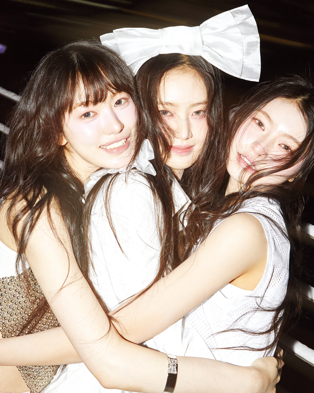 수이가 입은 톱은 Adekuver by Private Policy. 이솔이 입은 화이트 셔츠와 새틴 리본 헤어핀은 모두 스타일리스트 소장품. 하음이 입은 미디 드레스는 Ashley Williams.