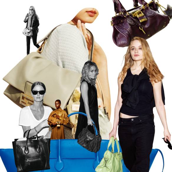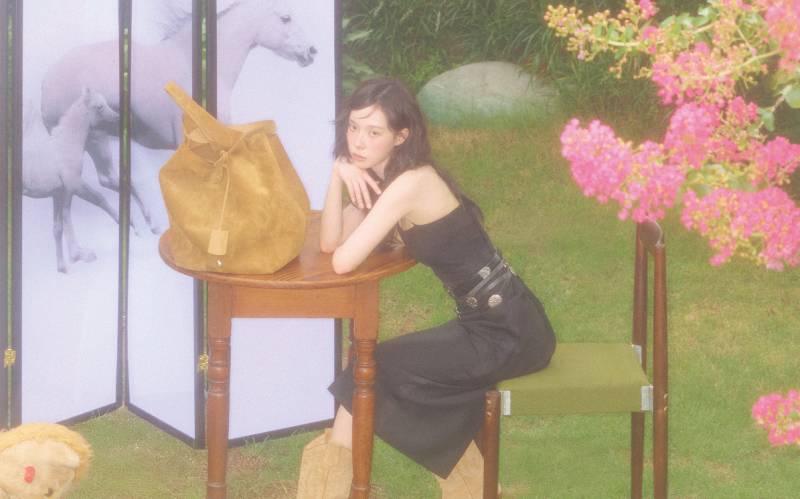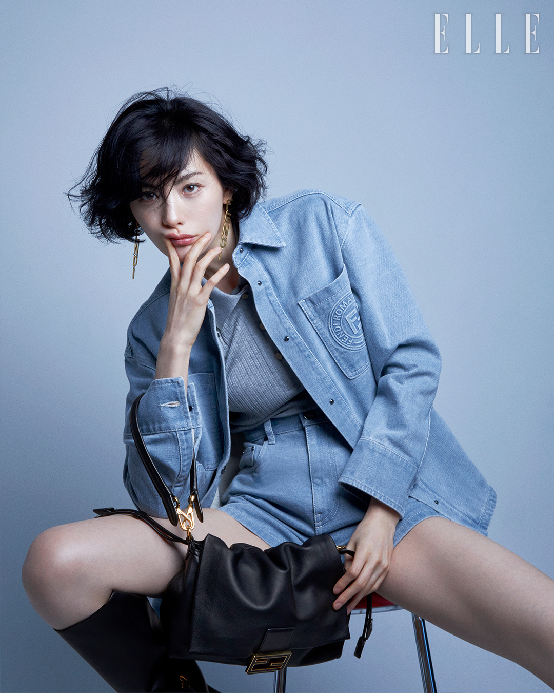끈을 조이는 방식의 스트링 여밈이 특징인 펜디 맘마 백. 부드러운 나파 가죽 소재의 펜디 스몰 맘마 백, 싱글브레스트 셔츠 칼라의 라이트 블루데님 재킷과 쇼츠, 하이힐 부츠, 펜디 레터링 드롭 이어링은 모두 Fendi.