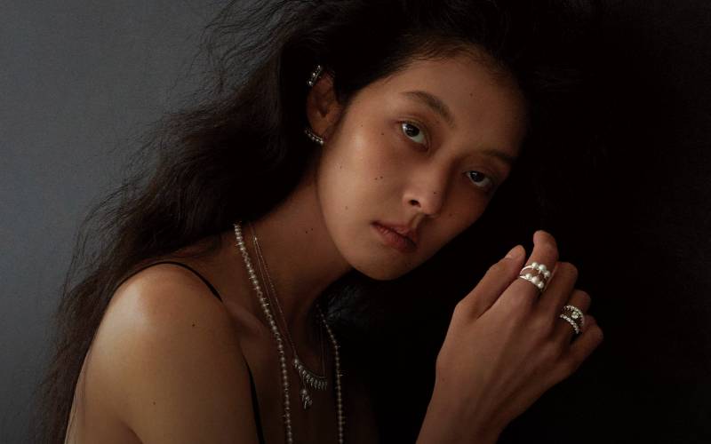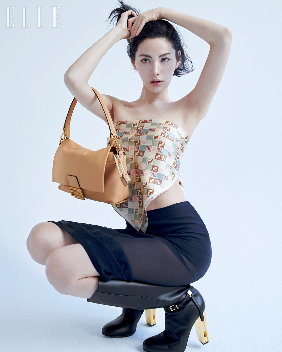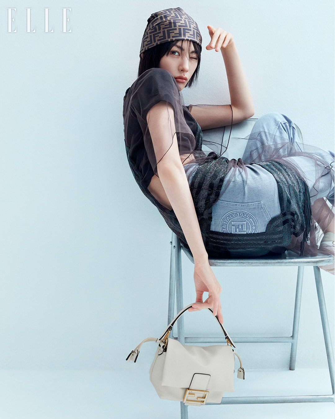 아이코닉한 디자인의 스몰 크림 컬러 펜디 맘마 백, 핸드 자수로 완성된 비즈와 버글 장식의 스트레이트 실루엣 롱 드레스, 로고 티셔츠, 스트레이트 컷 데님 팬츠, 타임리스 FF 프린트의 스퀘어 실크 스카프는 모두 Fendi.