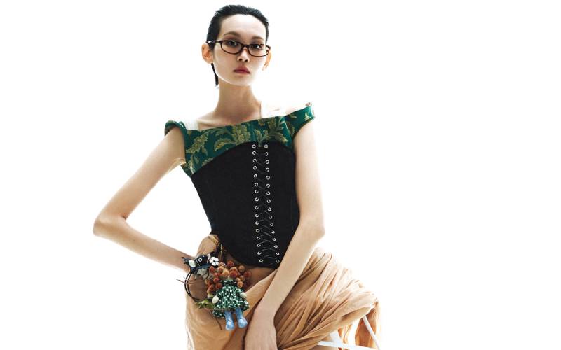 아이코닉한 바게트 백의 빅 사이즈 버전으로 탄생한 펜디 맘마 백. 마차 그린 컬러의 미디엄 사이즈 맘마 백, 그레이 컬러의 저지 모크넥, 니트 숏 팬츠, 핑크 자수의 튤 스커트, FF 스터드 버클 벨트, 레드윙과 협업하여 제작된 레이스업 앵클부츠는 모두 Fendi.