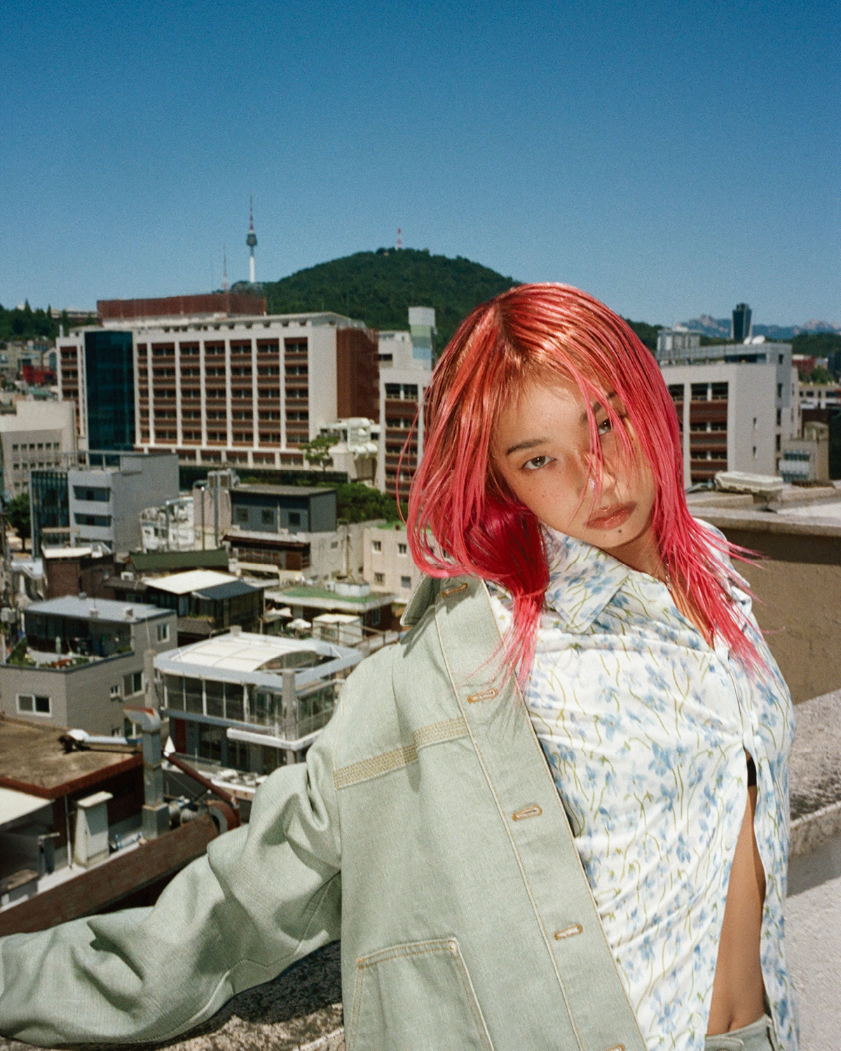 쿄카가 입은 데님 워크웨어 재킷과 쇼츠, 이너 웨어로 입은 플라워 셔츠는 모두 Loewe.