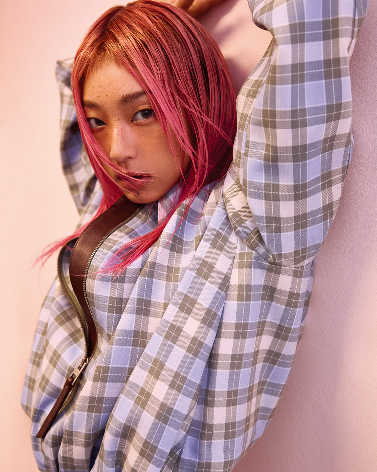 쿄카가 입은 체크 패턴의 드레이프 재킷은 Loewe.