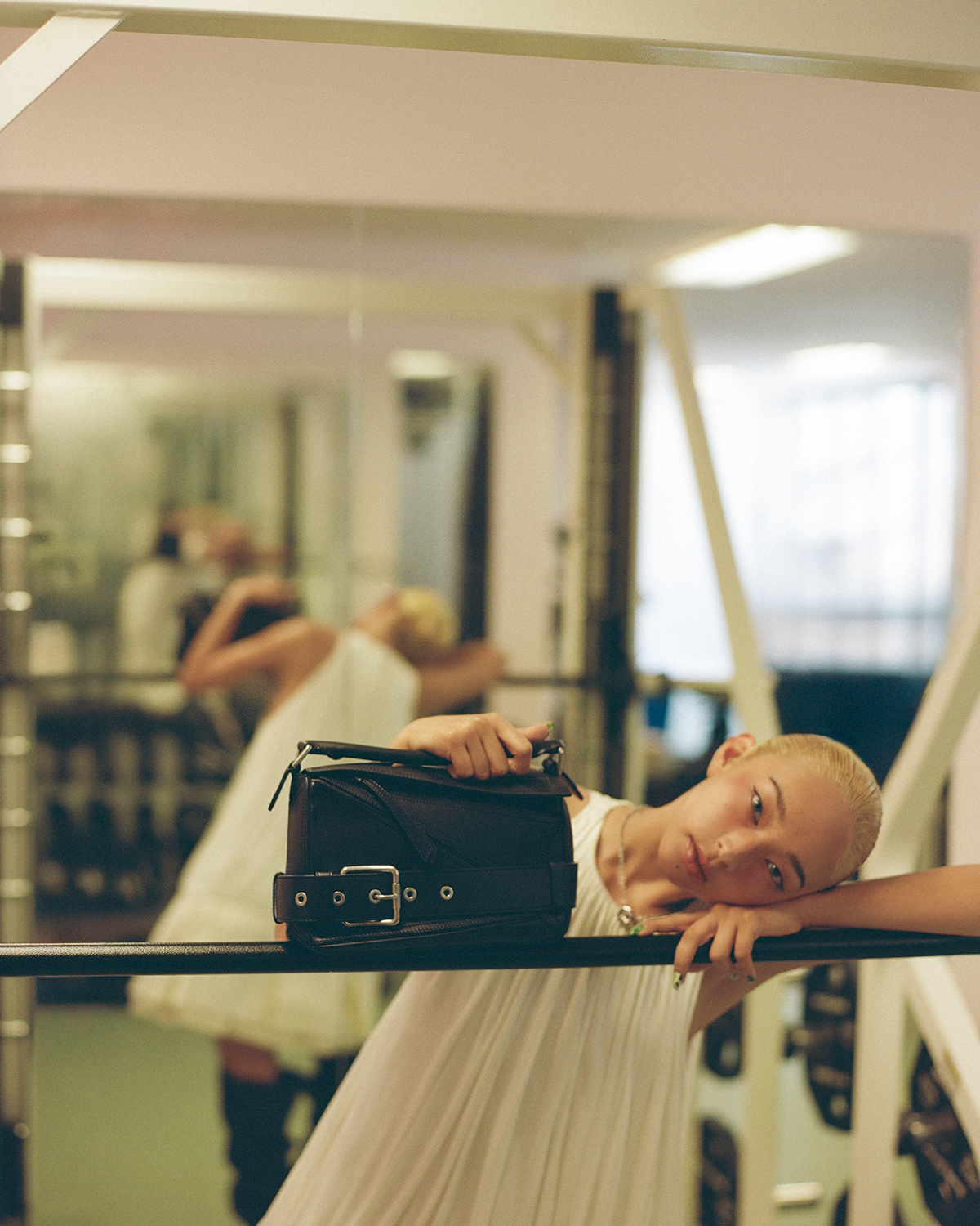 쿄카가 입은 블랙 플라멩코 드레스와 스니커즈, 네크리스, 카프스킨과 스웨이드를 조합한 퍼즐 백은 모두 Loewe.