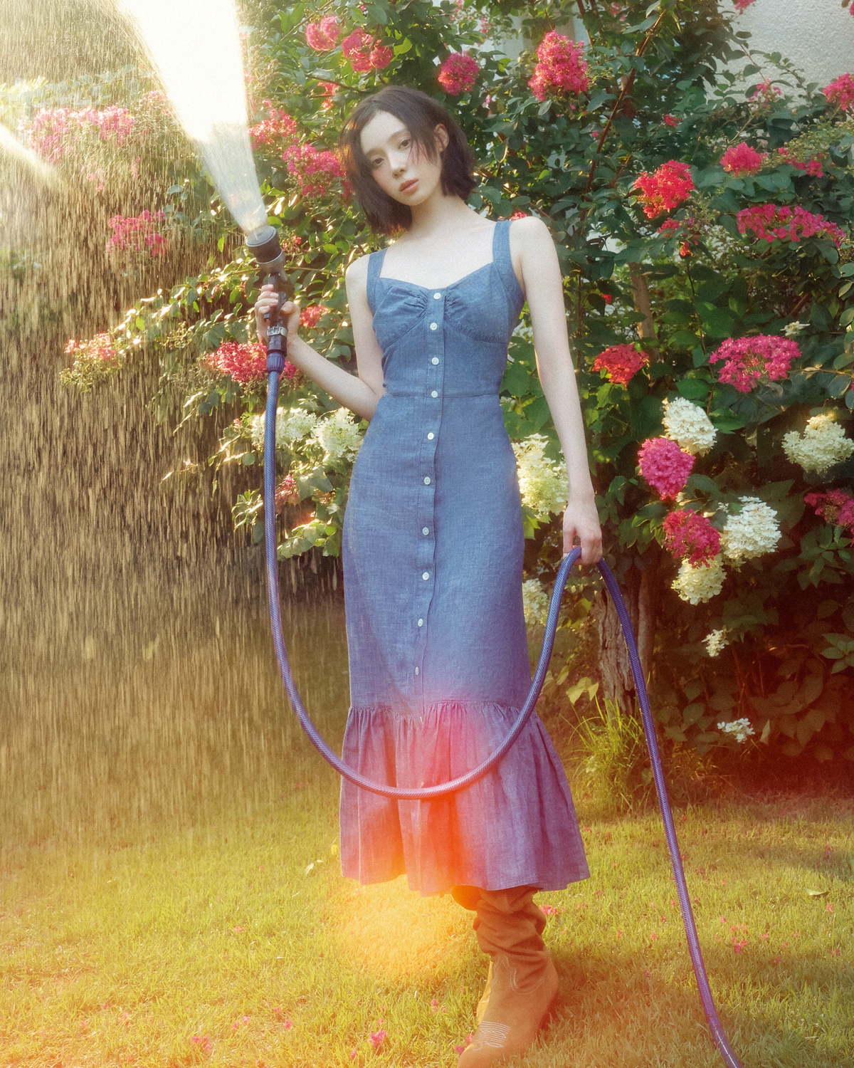 샴브레이 버튼 드레스와 웨스턴 부츠는 모두 Polo Ralph Lauren.