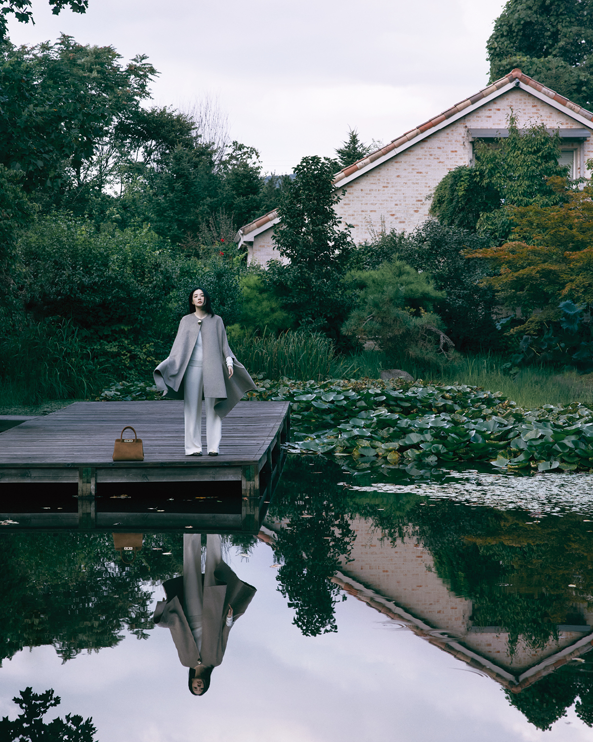 베이지 캐시미어 케이프와 스웨터, 와이드 팬츠, 스웨이드 토트백, 플랫 슈즈는 모두 Fabiana Filippi.