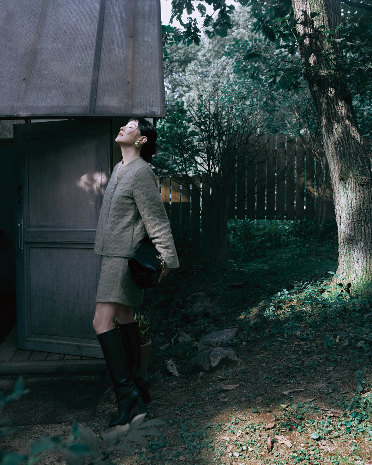웨이브 라인을 따라 퀼팅을 더한 재킷과 스커트, 볼드한 이어링, 나파 레더 아일릿 백과 하이힐 부츠는 모두 Fabiana Filippi.