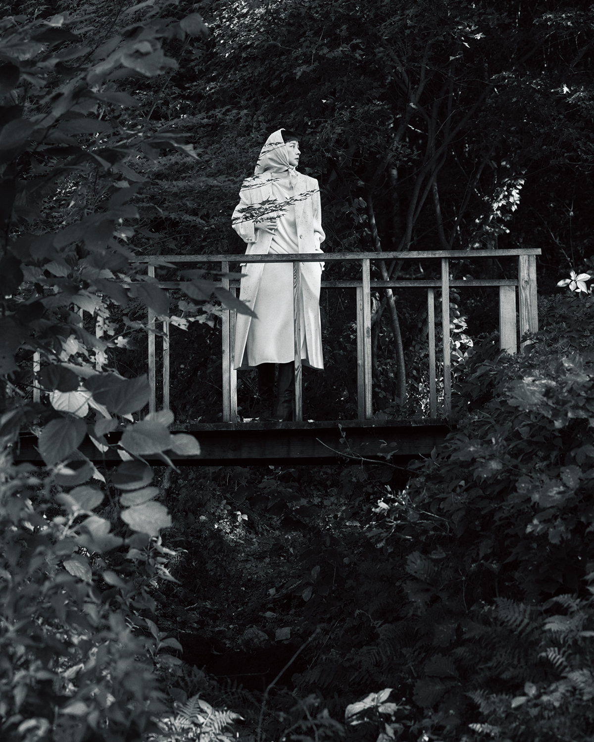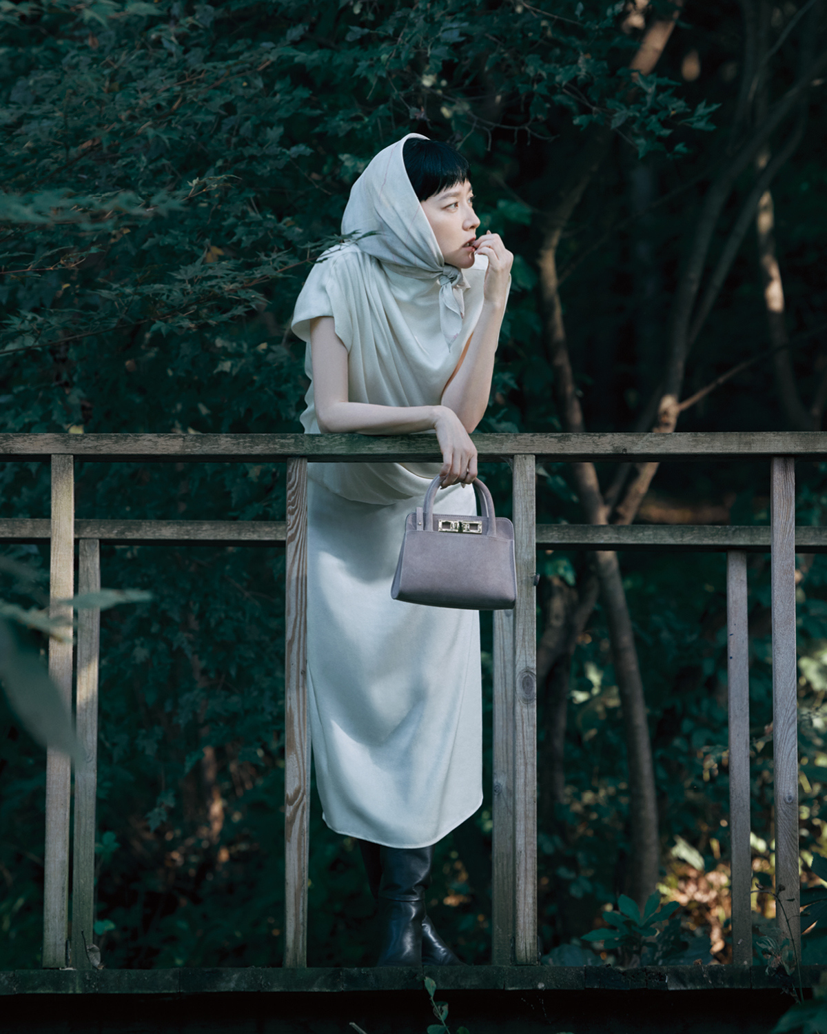 화이트 새틴 슬리브리스 드레스와 머리에 두른 스카프, 스웨이드 미니 토트백, 나파 레더 하이힐 부츠는 모두 Fabiana Filippi.