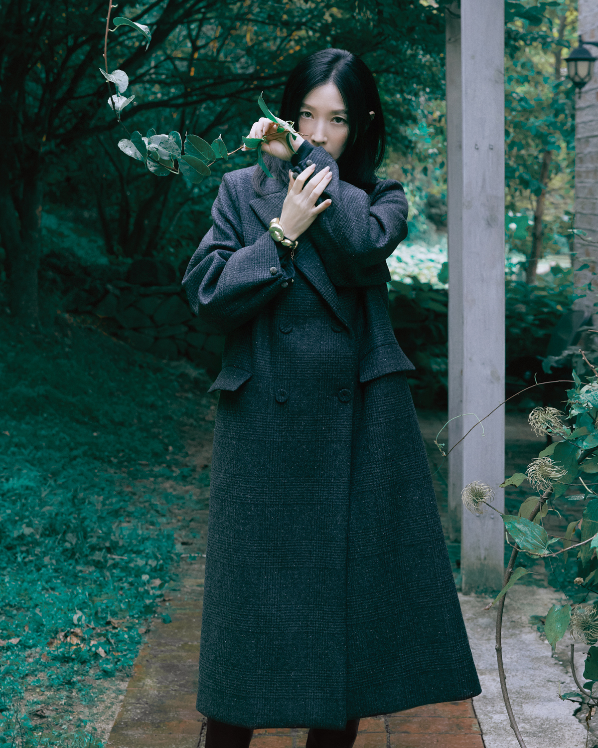 체크 패턴 더블 브레스티드 코트와 캐시미어 스웨터, 나파 레더 하이힐 부츠, 너깃 장식 브레이슬릿은 모두 Fabiana Filippi.