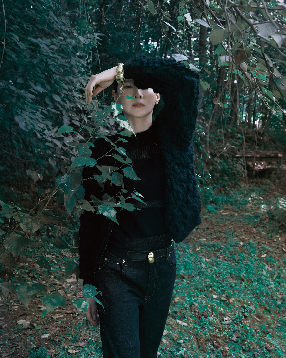 풍성한 모헤어 소재의 블랙 카디건과 스트라이프 패턴 시스루 스웨터, 데님 팬츠, 너깃 장식의 레더 벨트와 브레이슬릿은 모두 Fabiana Filippi.