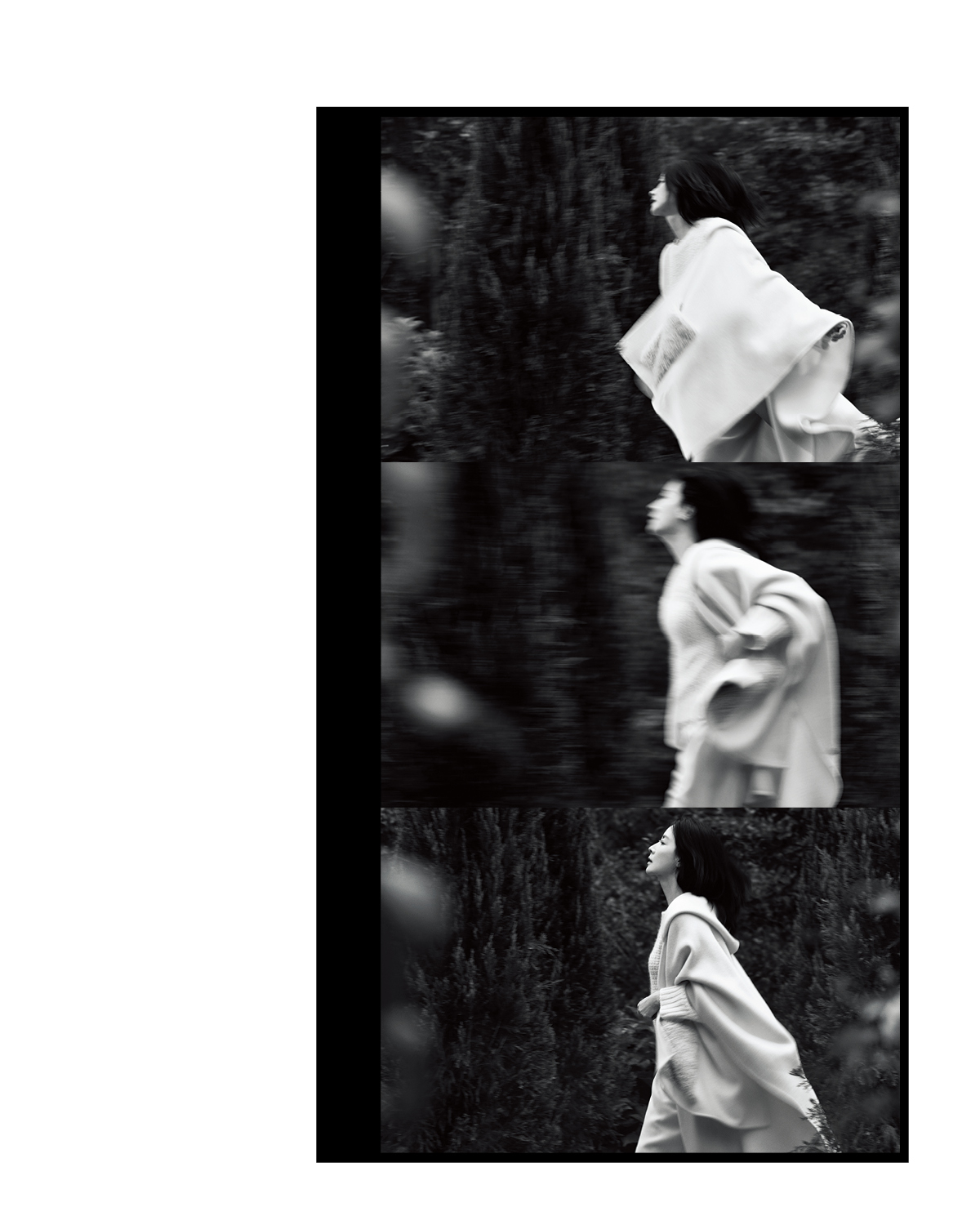 시어링 포켓 디테일의 화이트 케이프와 스퀘어 스티치 디테일의 스웨터, 와이드 팬츠는 모두 Fabiana Filippi.