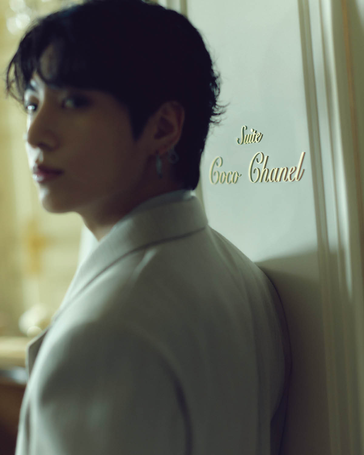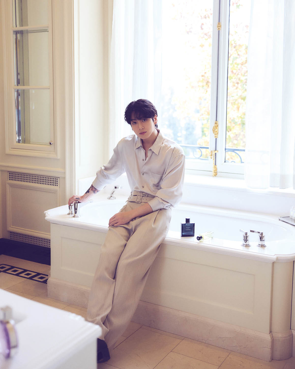 정국의 시선을 사로잡은 샤넬의 향수. 뉴칼레도니아산 샌들우드의 깊은 우디 향이 진취적인 남성의 이미지를 정의하는 블루 드 샤넬 오 드 빠르펭, 100ml 21만1천원, 샤넬이 좋아했던 베이지 컬러에서 영감을 얻은 온화한 안식처 같은 향으로 자연스럽게 기품을 더해주는 레 젝스클루시프 드 샤넬 베쥬, 75ml 38만원, 모두 Chanel.