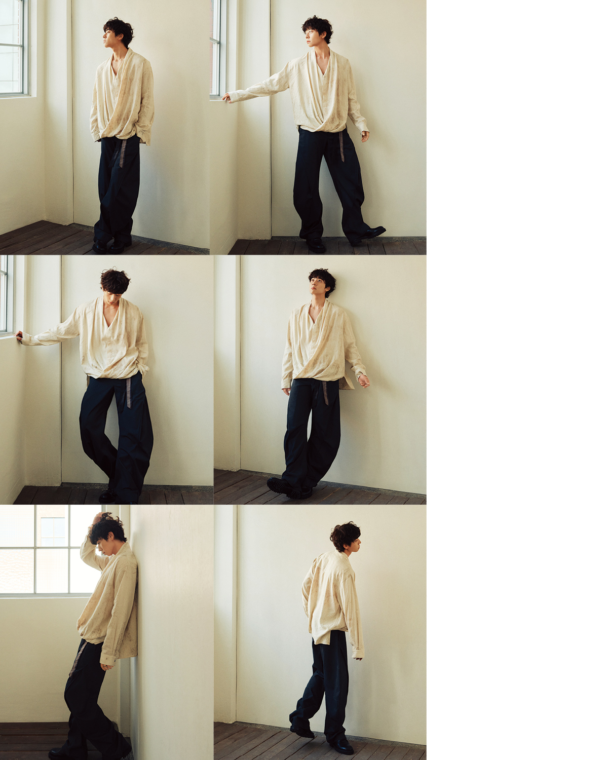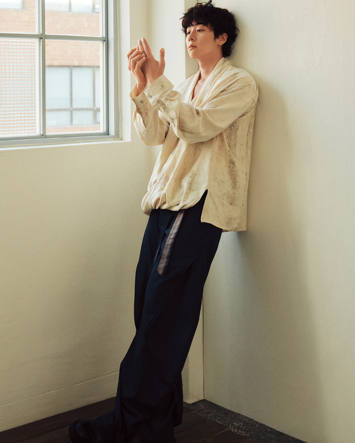 드레이프 셔츠와 벨티드 팬츠는 모두 Jiyong Kim by 10 Corso Como Seoul. 블랙 더비 슈즈는 스타일리스트 소장품.