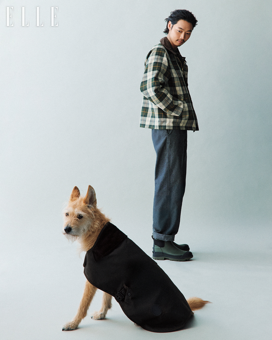 트렌디한 크롭트 실루엣의 트랜스포트 나일론 캐주얼 재킷, 클래식한 브룸 럭비 셔츠, 첼시 부츠 스타일의 숏 레인 부츠 님버스 첼시 웰리, 타탄 패턴 도그 코트는 모두 Barbour. 팬츠는 모델 개인 소장품.