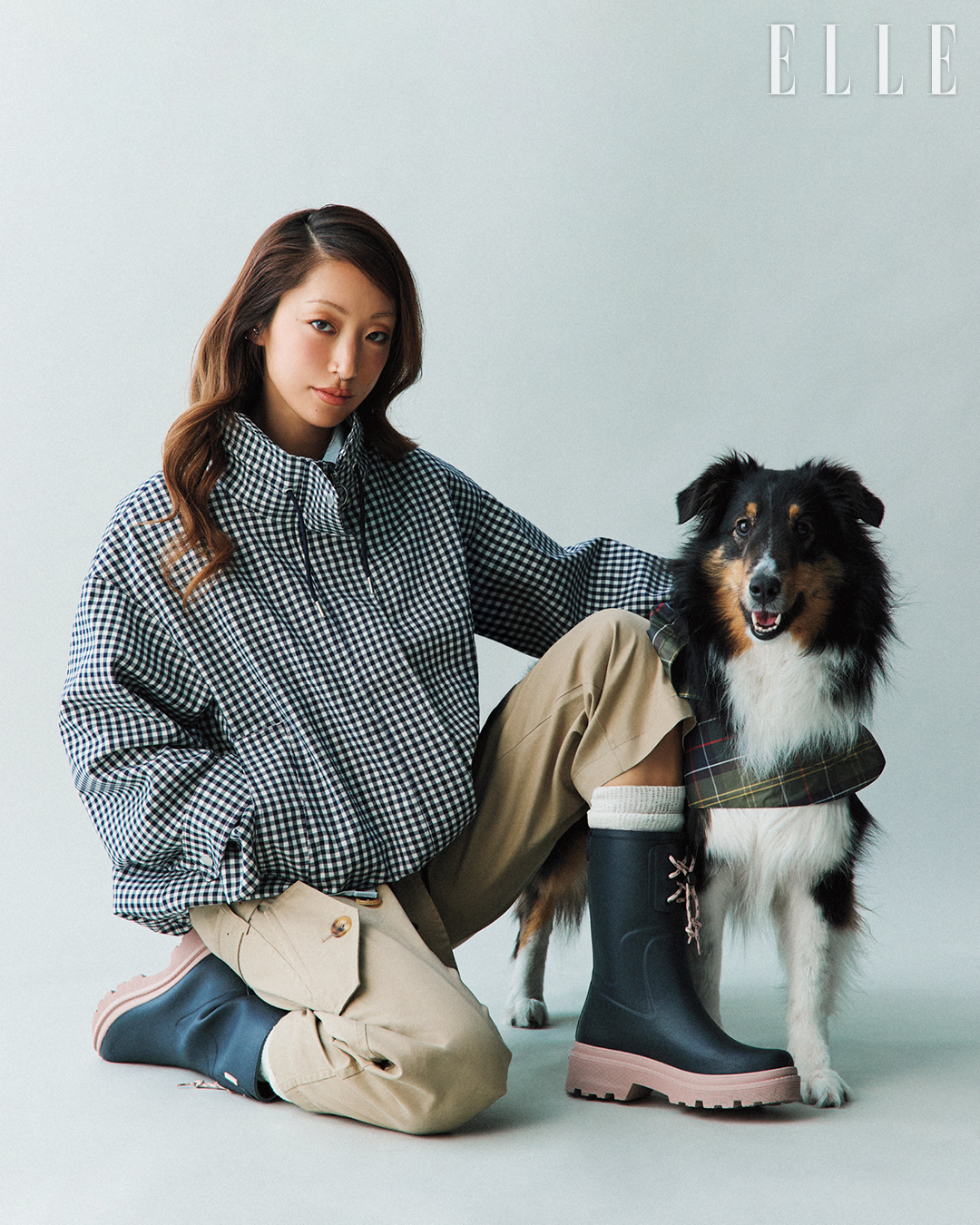 바버의 헤리티지가 담긴 체크 패턴의 브론윈 체크 샤워프루프 재킷, 패커블 타탄 도그 코트, 데블린 미드 웰리는 모두 Barbour. 팬츠와 삭스, 이어링은 모델 개인 소장품.