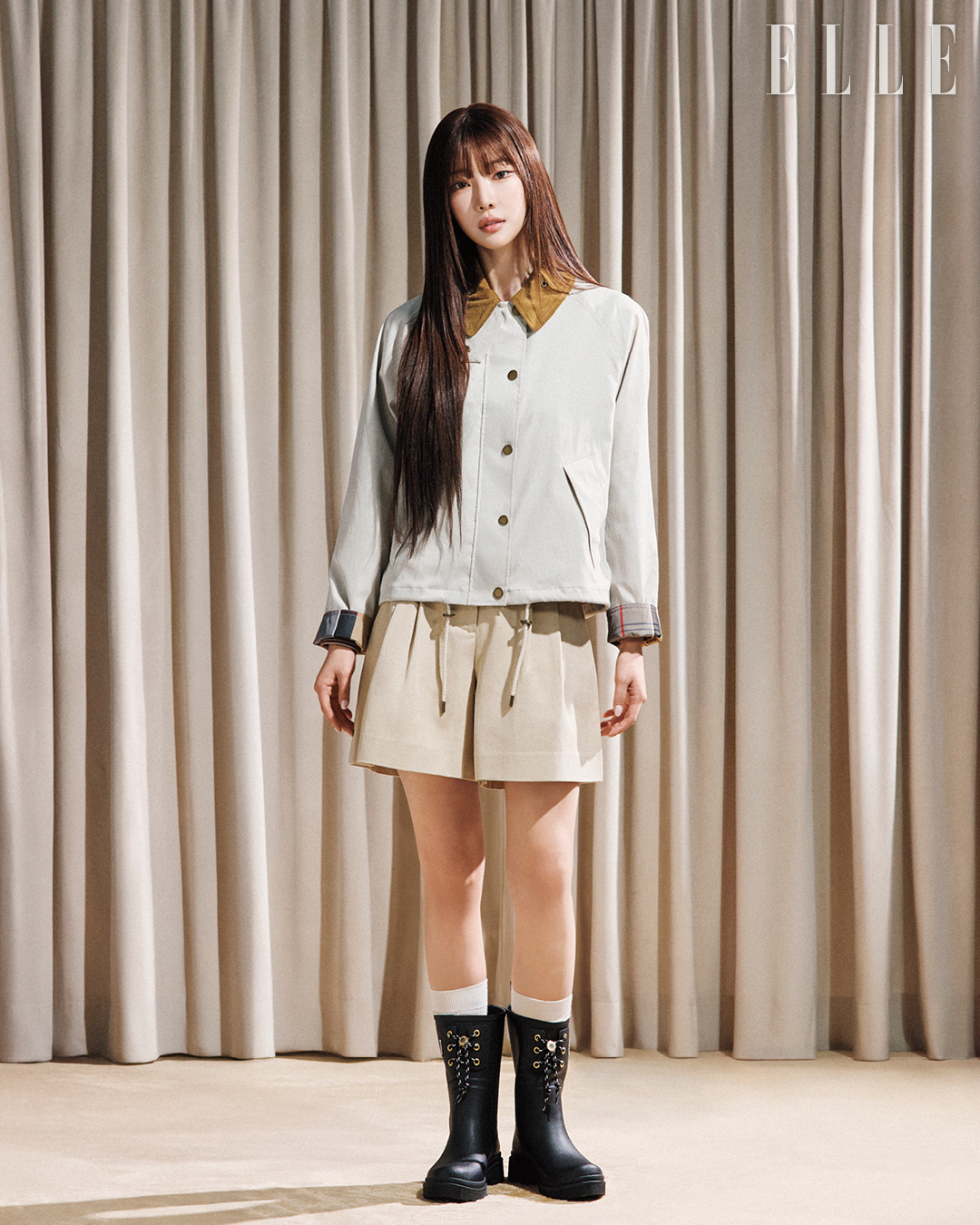 가벼운 비를 막아줄 기능성 소재로 완성된 소피 샤워프루프 재킷과 바버 데블린 미드 웰리는 모두 Barbour. 쇼츠와 삭스는 모델 개인 소장품.