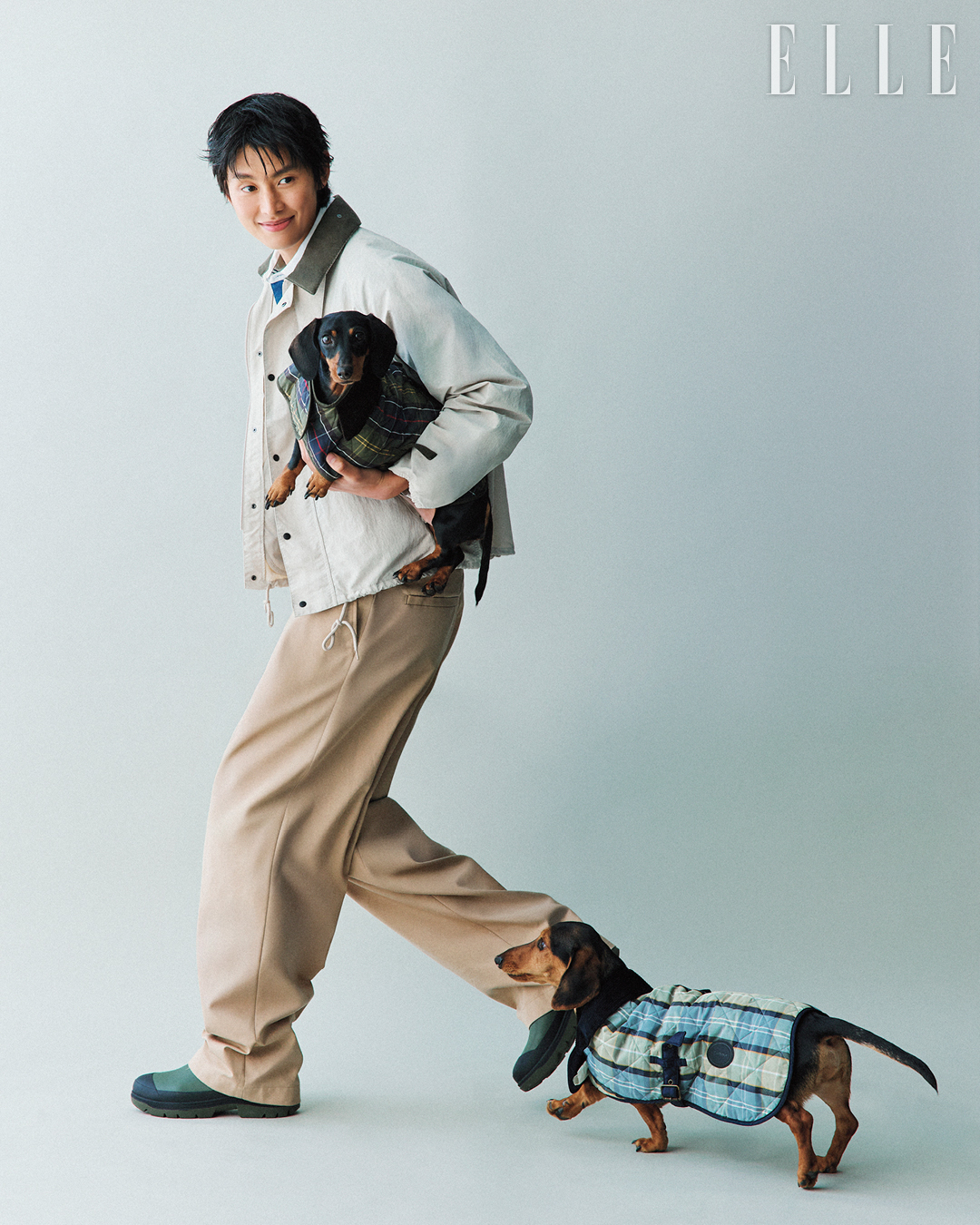 간절기 내내 산뜻하게 걸칠 수 있는 스페이 캐주얼 재킷, 컬러 블록이 더해진 데블린 미드 웰리, 타탄 패턴 워터프루프 도그 코트는 모두 Barbour. 톱과 쇼츠, 벨트, 삭스는 모델 개인 소장품.