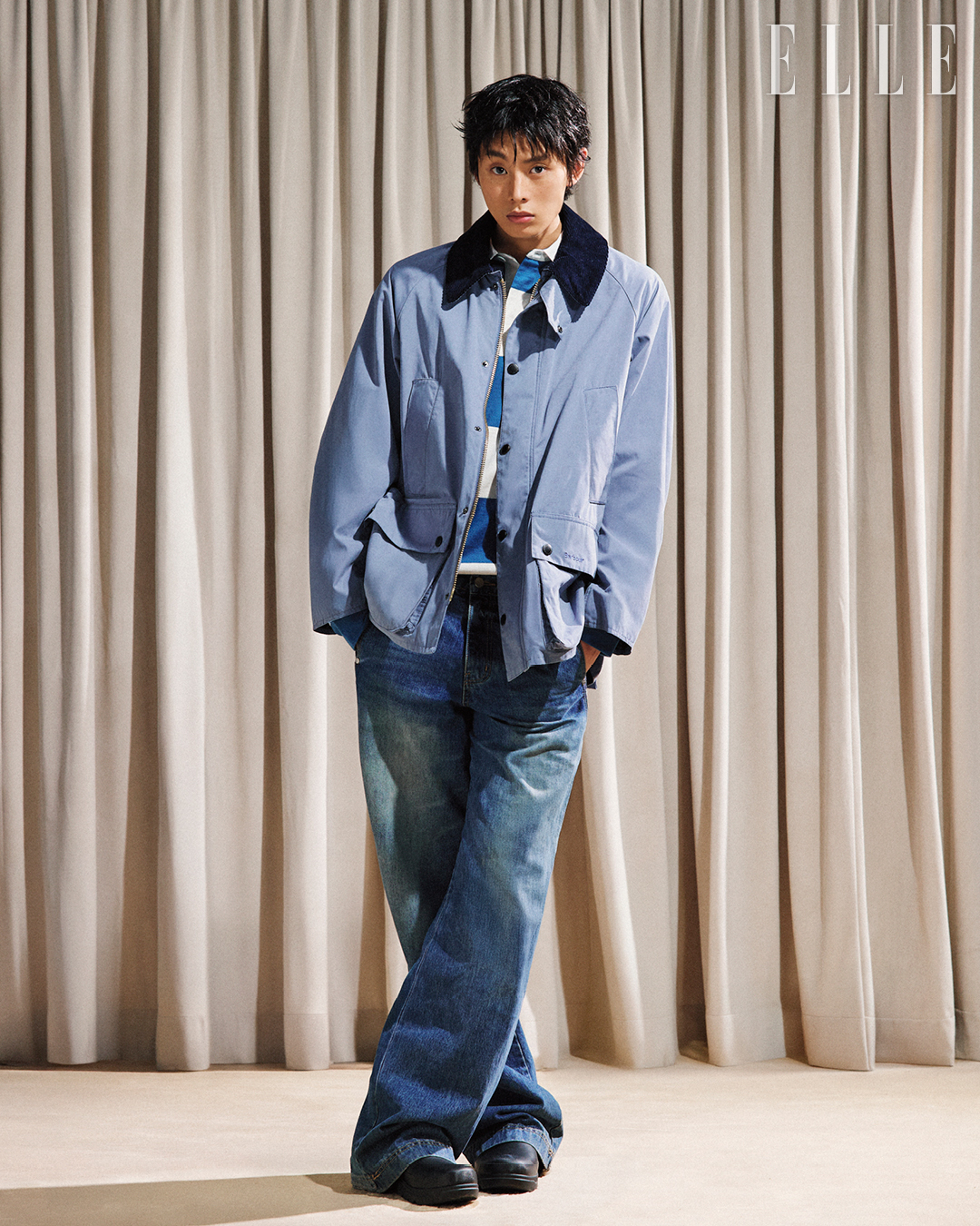 부드러운 피치드 코튼 소재의 오버사이즈 핏 피치드 비데일 캐주얼 재킷, 브룸 럭비 셔츠, 데블린 미드 웰리는 모두 Barbour. 팬츠는 모델 개인 소장품.