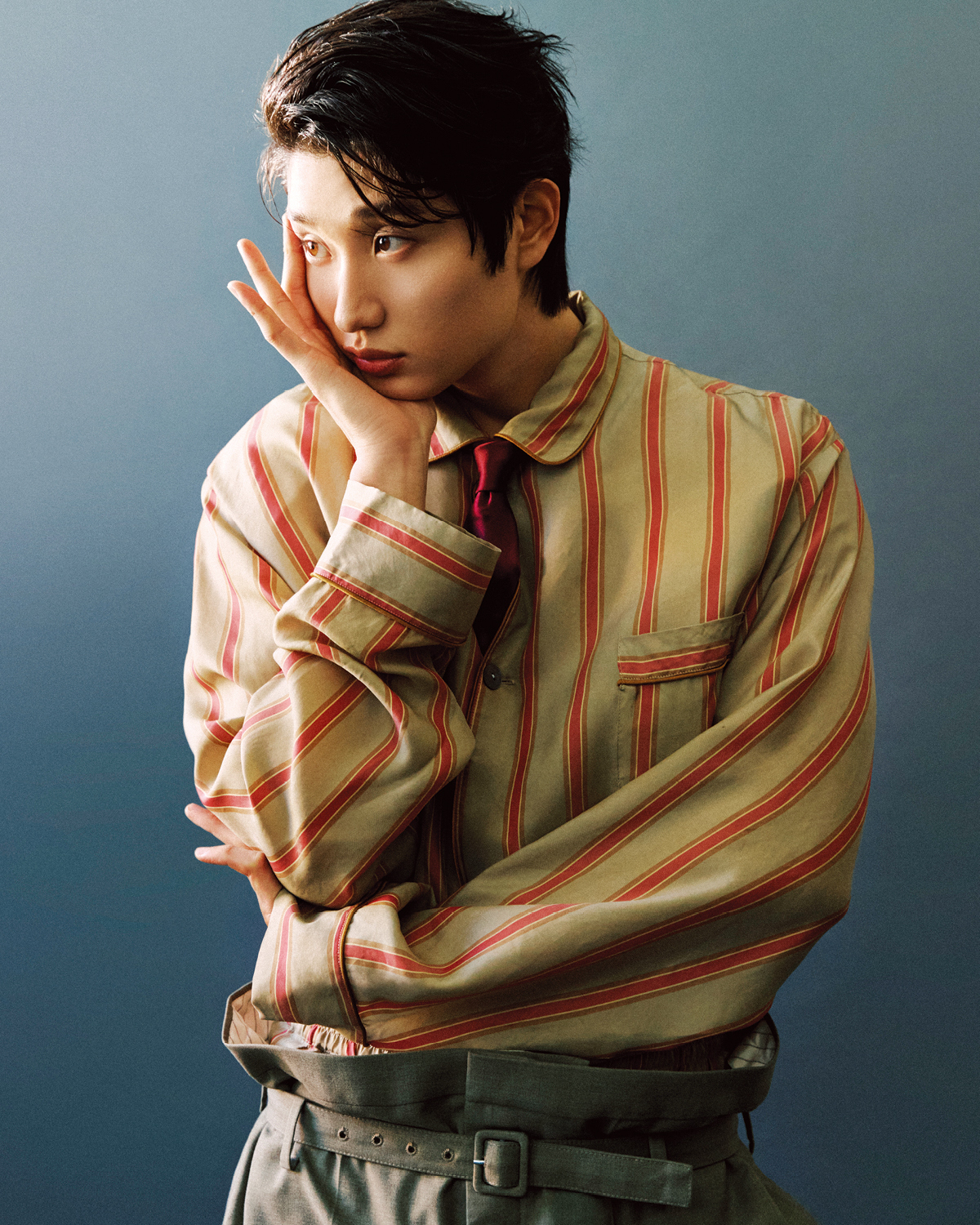 베이지 스트라이프 셔츠와 쇼트팬츠 세트업, 레드 타이와 베이지 팬츠는 모두 Saint Laurent by Anthony Vaccarello.