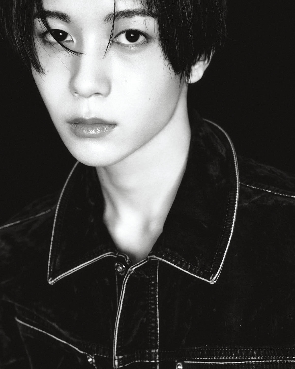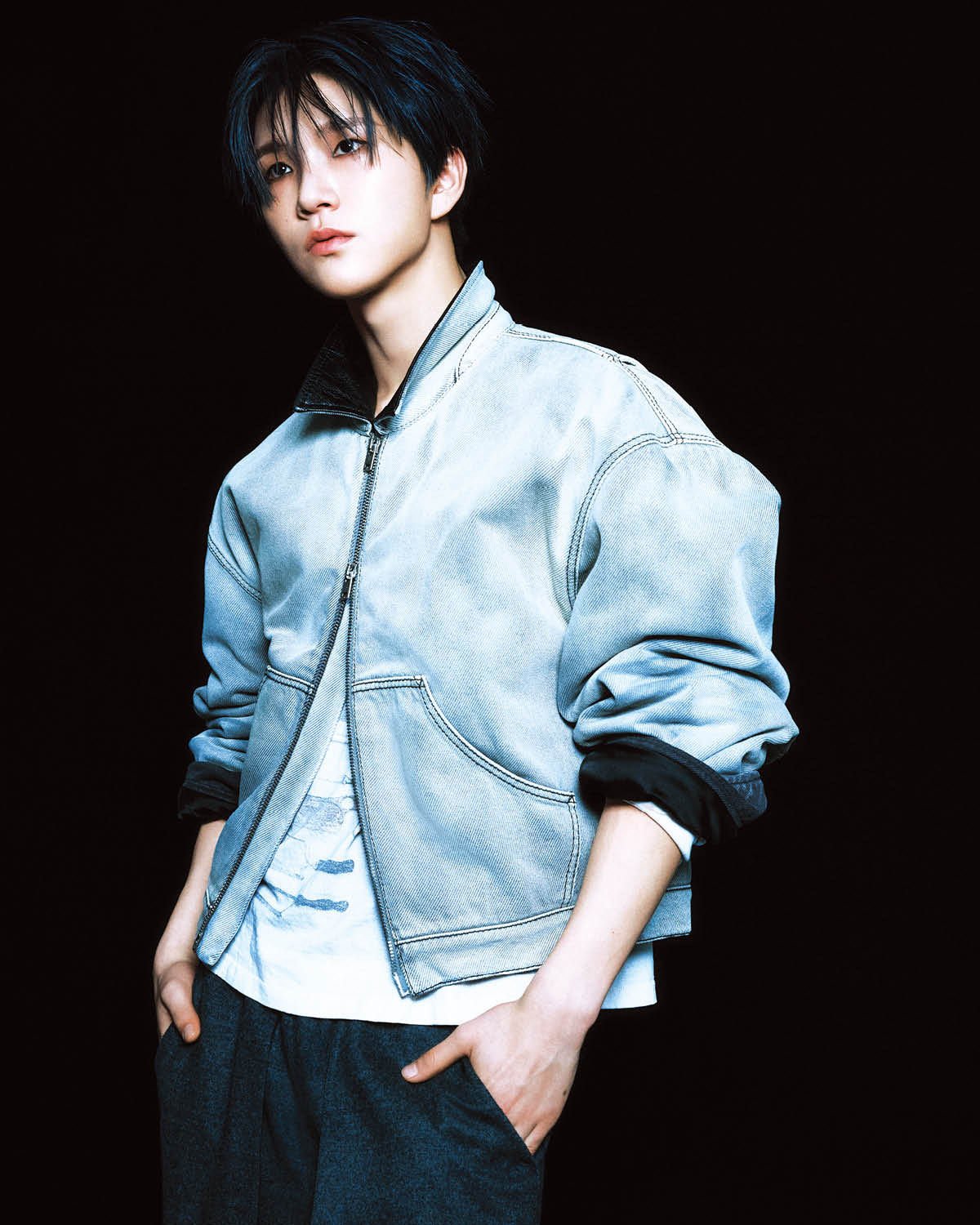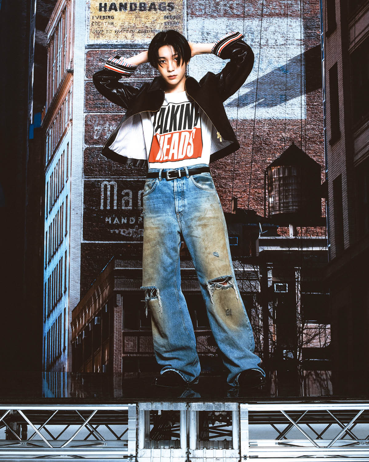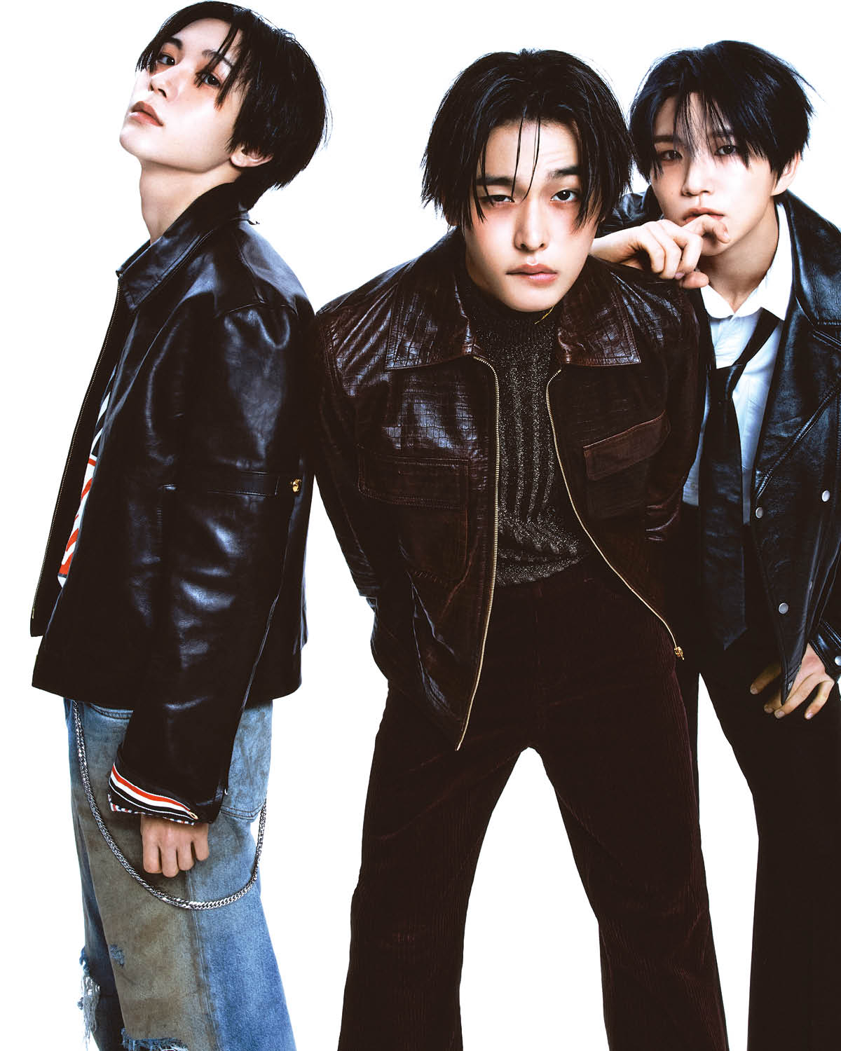 료가 입은 레더 재킷은 Thom Browne. 티셔츠는 Madeworn by Mue. 데님 데미지 팬츠는 Acne Studios. 체인은 스타일리스트 소장품. 리쿠가 입은 레더 재킷과 글리터 톱, 팬츠는 모두 Amiri. 재희가 입은 블랙 재킷은 Saint Laurent. 셔츠와 팬츠, 타이는 스타일리스트 소장품.