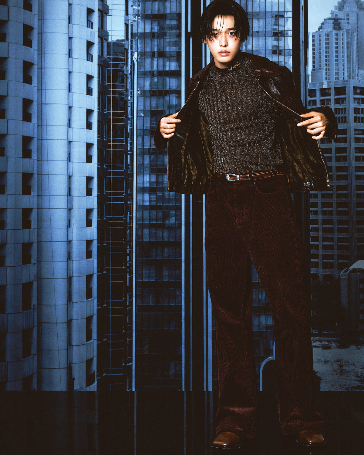 레더 재킷과 글리터 톱, 팬츠와 슈즈는 모두 Amiri. 브라운 벨트는 Our Legacy.
