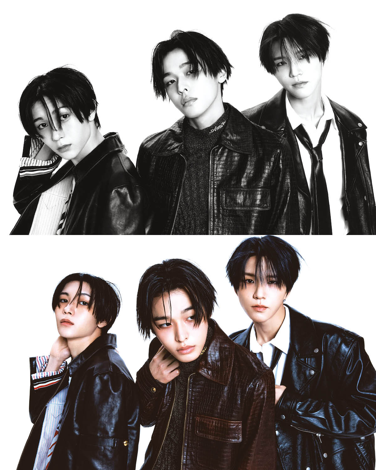 료가 입은 레더 재킷은 Thom Browne. 티셔츠는 Madeworn by Mue. 리쿠가 입은 레더 재킷과 글리터 톱은 모두 Amiri. 재희가 입은 블랙 재킷은 Saint Laurent. 셔츠와 타이는 스타일리스트 소장품.