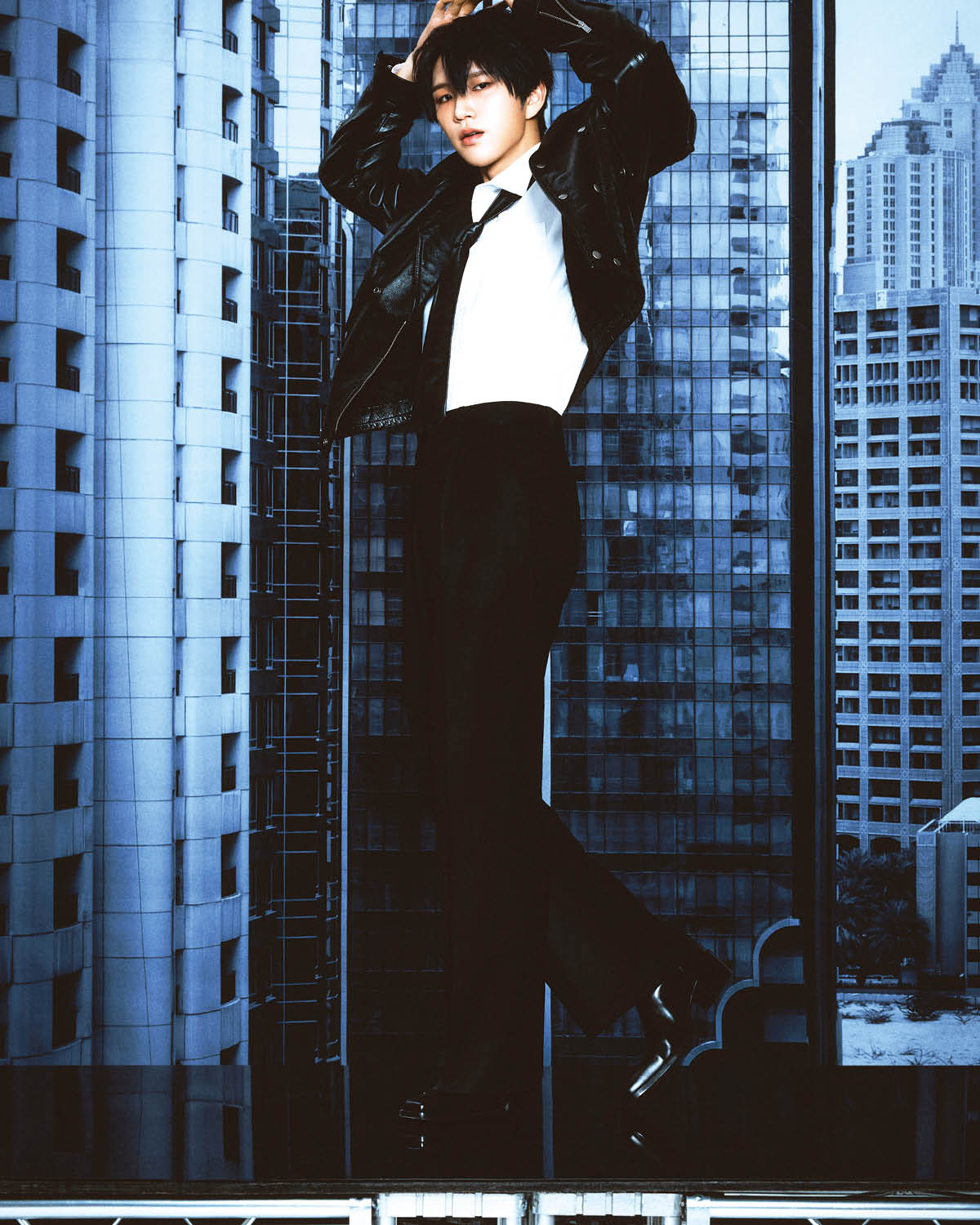 레더 바이커 재킷은 Saint Laurent. 셔츠와 팬츠, 타이와 슈즈는 스타일리스트 소장품.