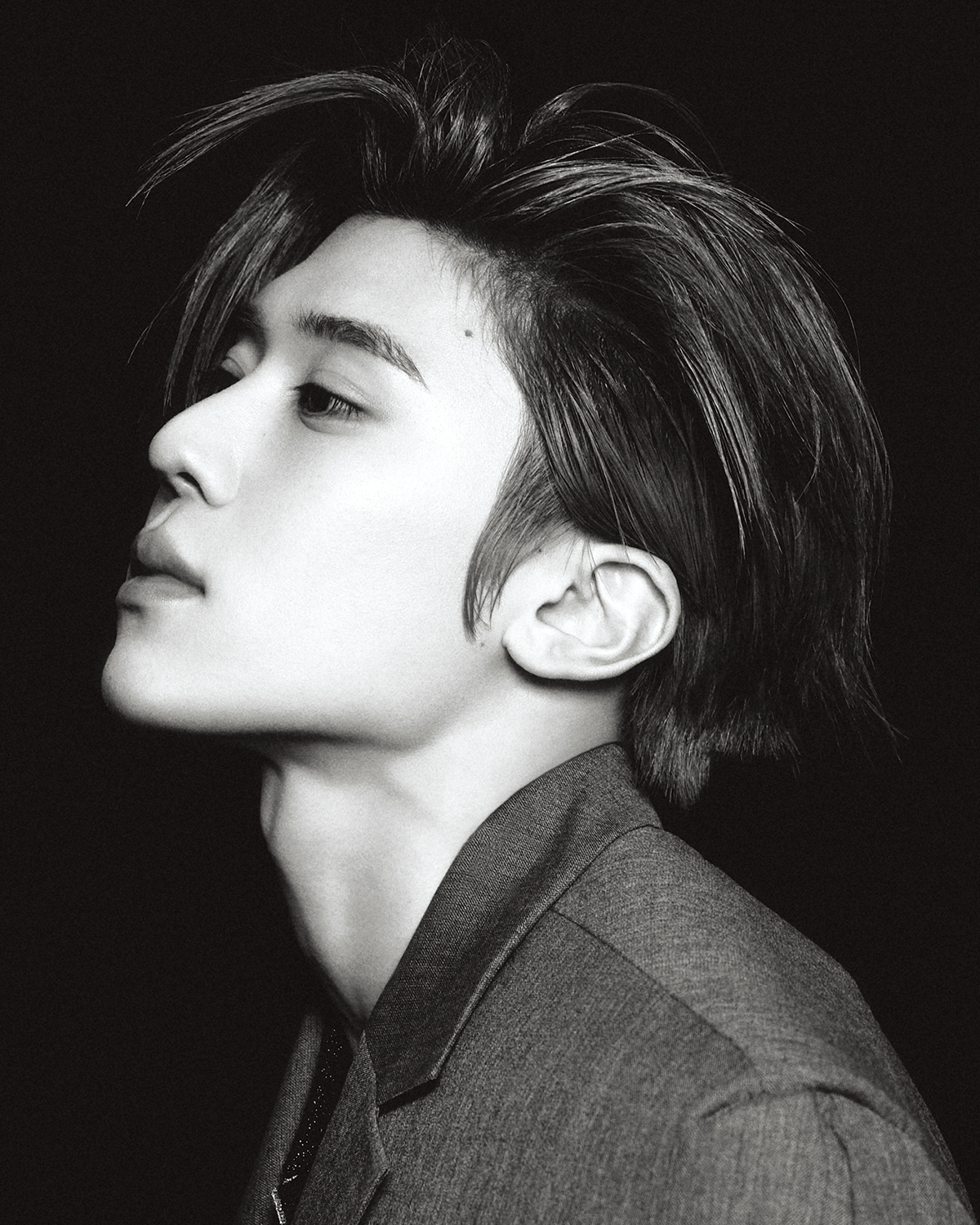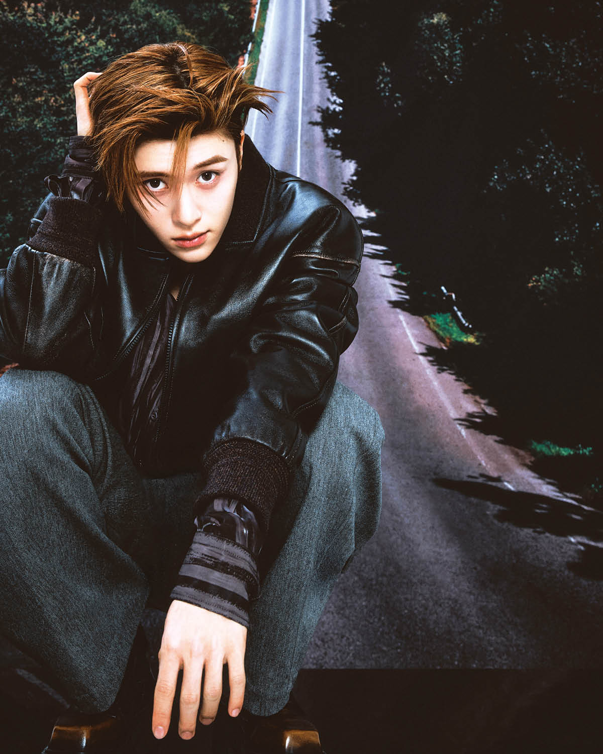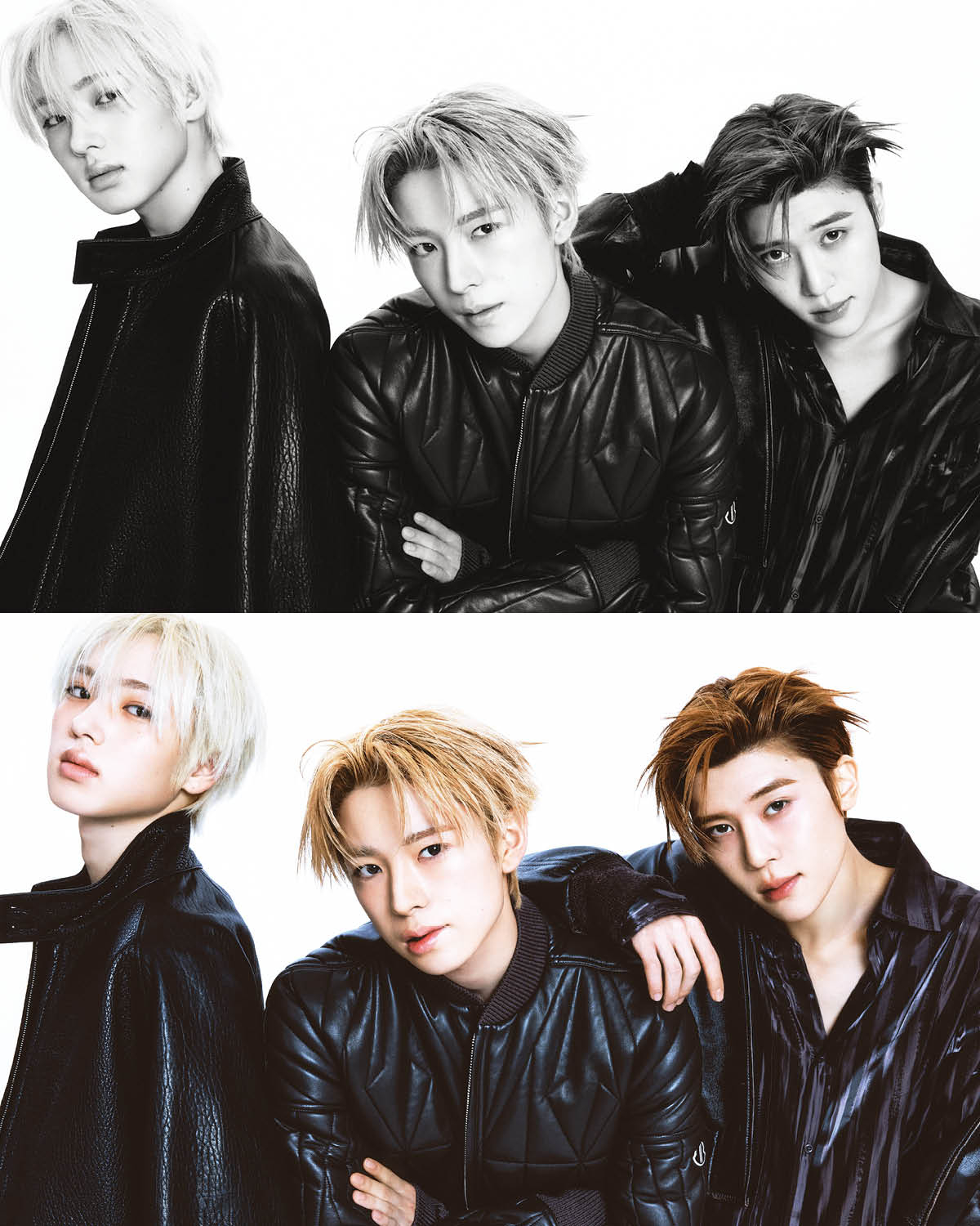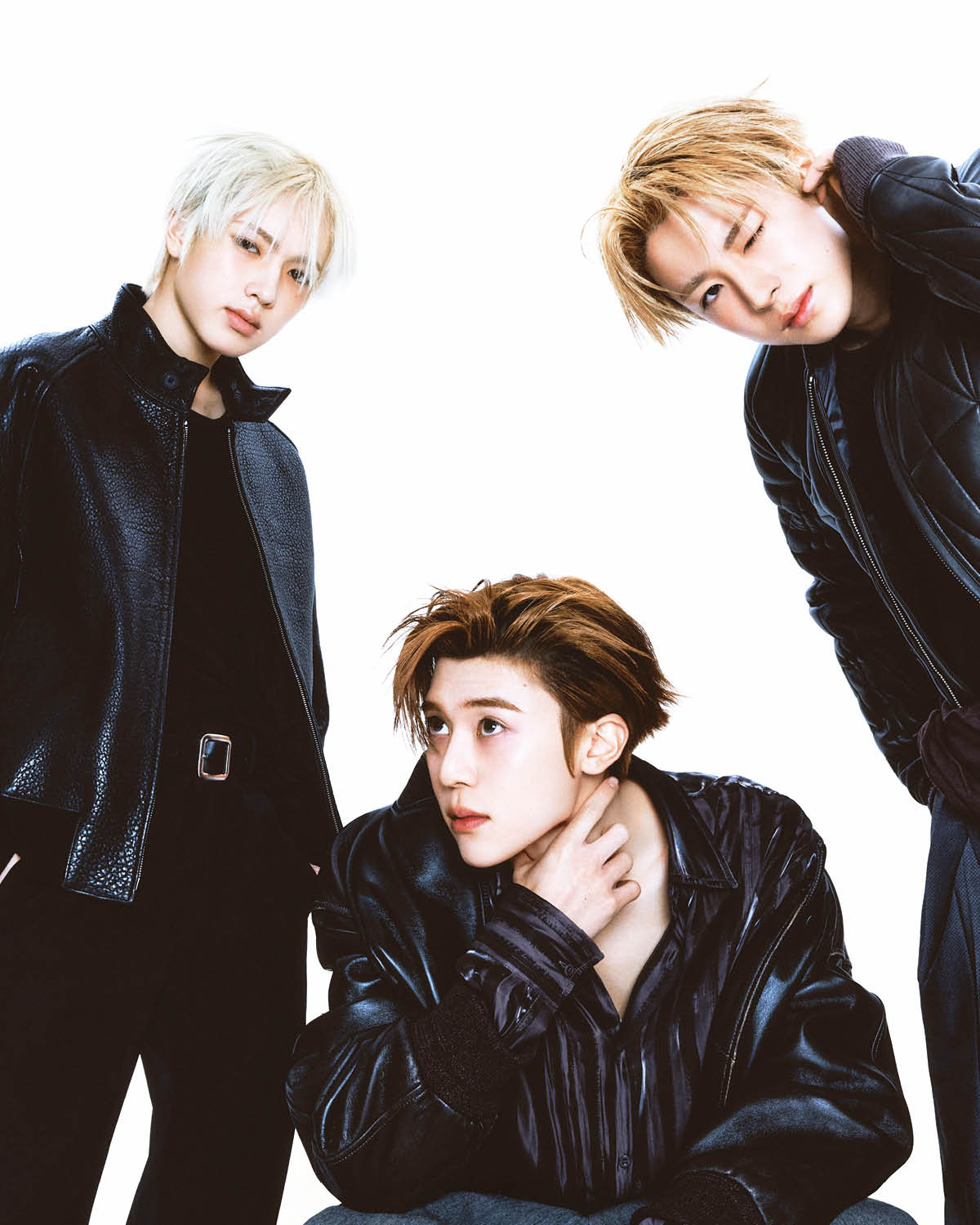 사쿠야가 입은 레더 재킷은 Studio Nicholson. 블랙 톱은 Rick Owens. 블랙 팬츠는 Jil Sander. 벨트는 스타일리스트 소장품. 시온이 입은 레더 재킷과 그레이 팬츠는 Recto. 셔츠는 Acne Studios. 유우시가 입은 레더 패딩 재킷과 브라운 톱은 모두 Moncler x Rick Owens. 팬츠는 스타일리스트 소장품.