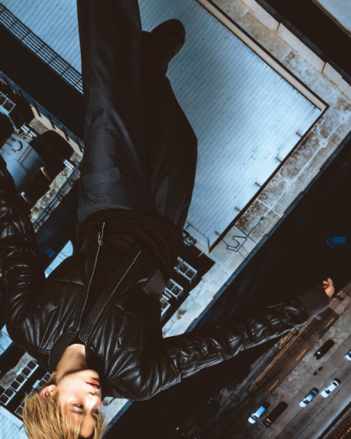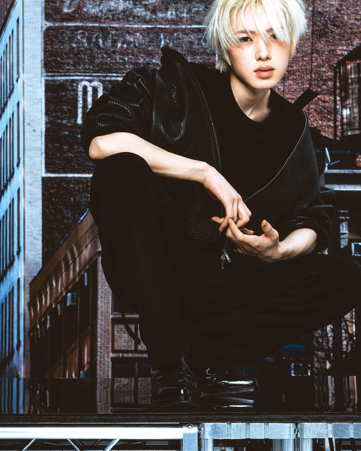 레더 재킷은 Studio Nicholson. 블랙 이너 웨어 톱은 Rick Owens. 와이드 팬츠는 Jil Sander. 블랙 앵클부츠는 Ernest W. Baker.